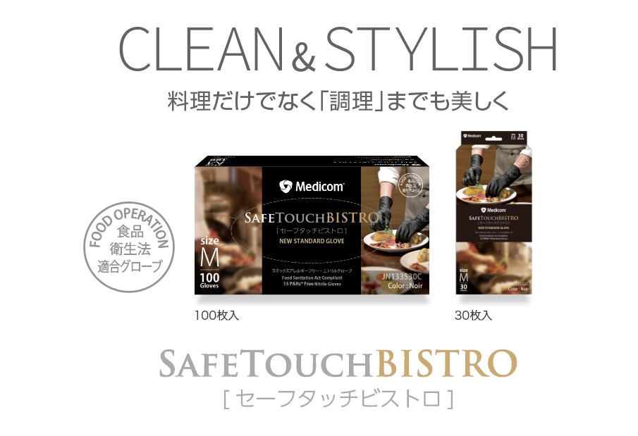 「セーフタッチビストロ」は、高級感のあるNoir(ノアール:黒)のグローブなので、調理空間をスタイリッシュに演出し、料理をさらに引き立てます。今回、現在発売中の100枚入りに加えて、30枚入りの販売を開始しました。
