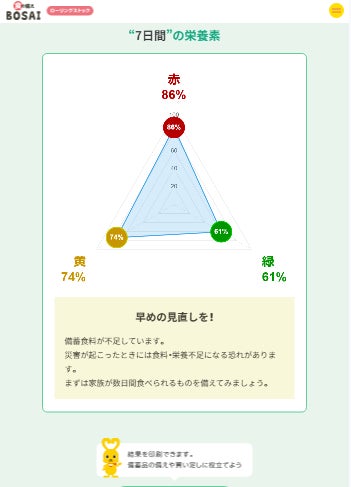 各家庭に必要な備蓄量や家庭内にある食品の栄養バランスを把握することで、食料備蓄率の向上や栄養バランスに配慮した備蓄につながればと考えています。