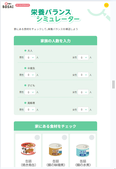 家族構成を入力するだけで必要な備蓄量の目安を算出