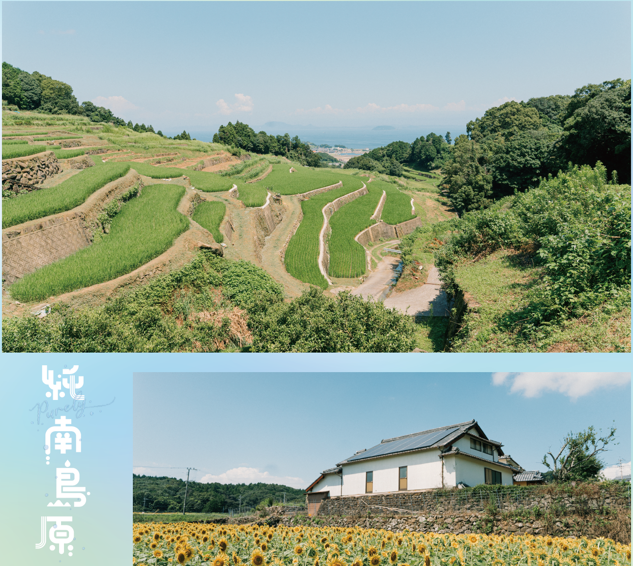 南島原市は、長崎県島原半島南部に位置し、北は雲仙普賢岳、南は有明海に面しています。国立公園「雲仙天草国立公園」、世界文化遺産「原城跡」など貴重な自然環境と歴史文化を持つまちです。長崎県ではじめて「オーガニックビレッジ宣言」をした南島原市は、市内で働く5人に1人が農業従事者*の農業大国でもあります。安心・安全の代名詞として“純国産”の言葉があるように、“純”南島原産まれであることがひとつの象徴となることを目指し、県内はもとより、全国、海外のみなさまへ、純南島原の魅力をお届けします。
