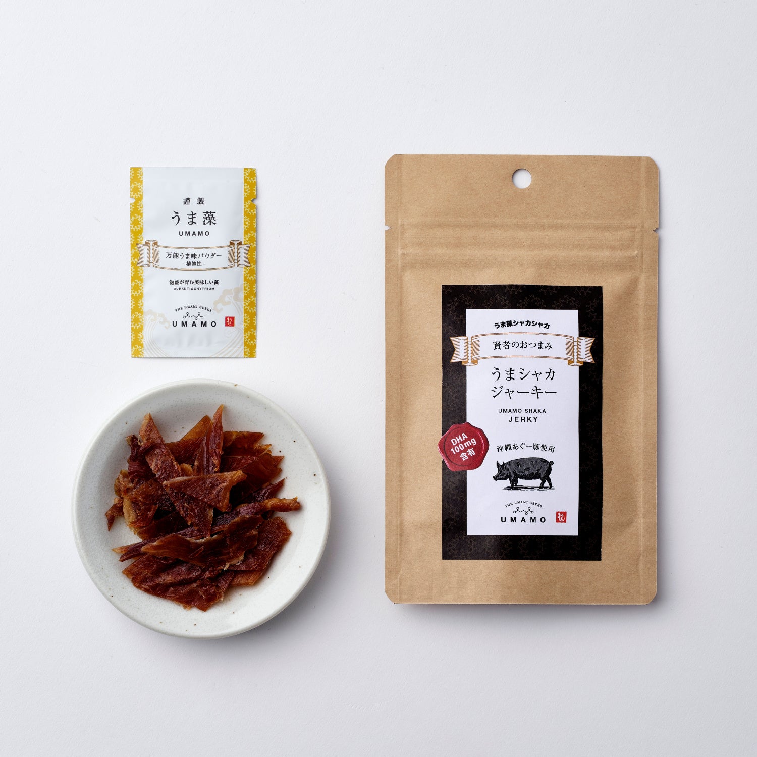 そんな思いから生まれた第一弾商品が、沖縄が誇る食材「あぐー豚」とうま藻をかけ合わせた「うまシャカジャーキー」です。パッケージを開けると香る、香ばしいあぐー豚ジャーキーに、付属のうま藻を振りかけて、袋ごとシャカシャカすれば完成!