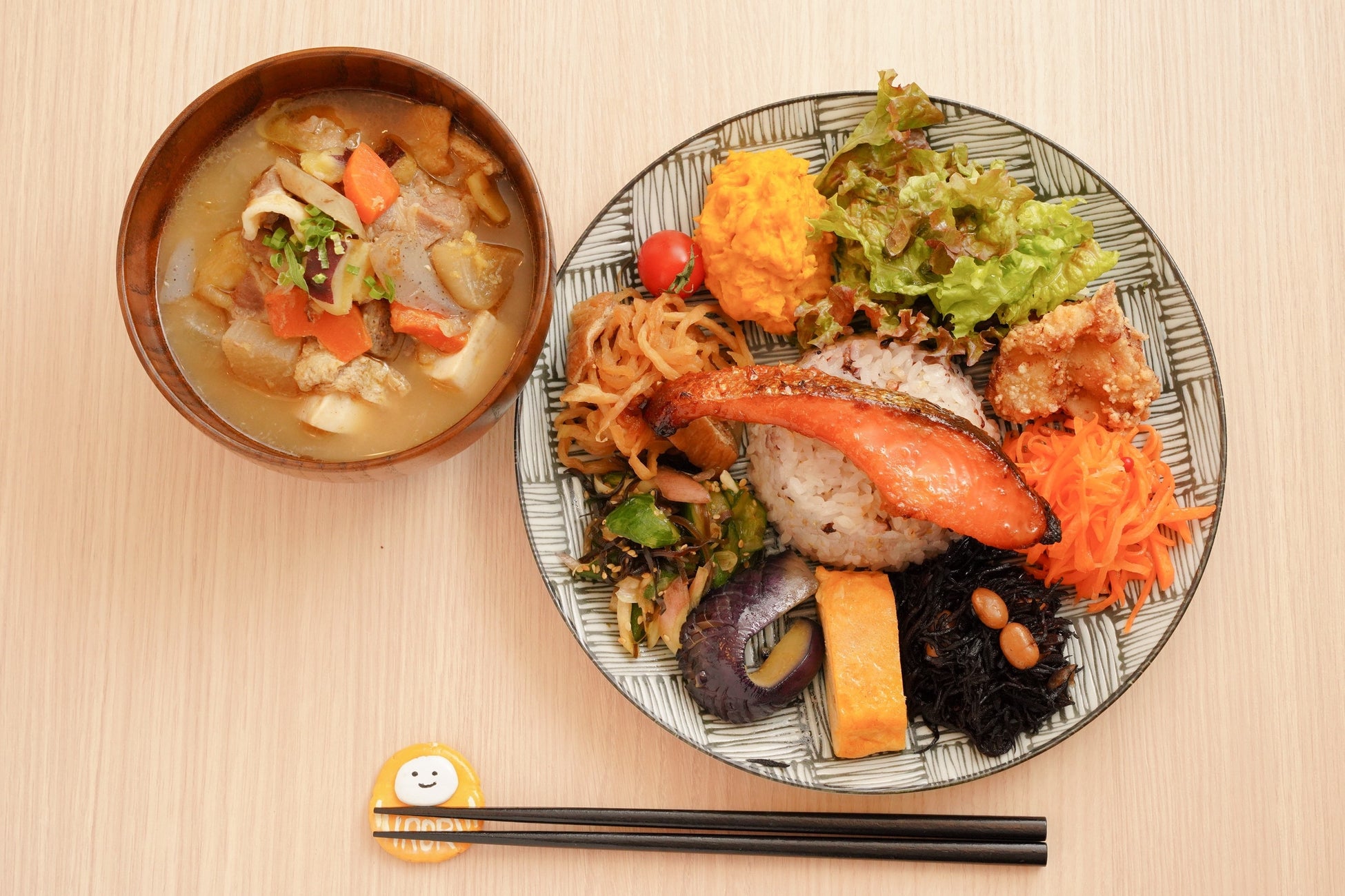 「“ワンプレートで韓国料理”だからこそ、いろいろな味を少しずつ楽しめる構成にしました。キンパ、チョレギサラダ、チーズボール、ヤンニョムチキン、クリームチーズチャンジャ、トッポギ、チャプチェなど、食感や香りのバランスを意識して盛り合わせています。