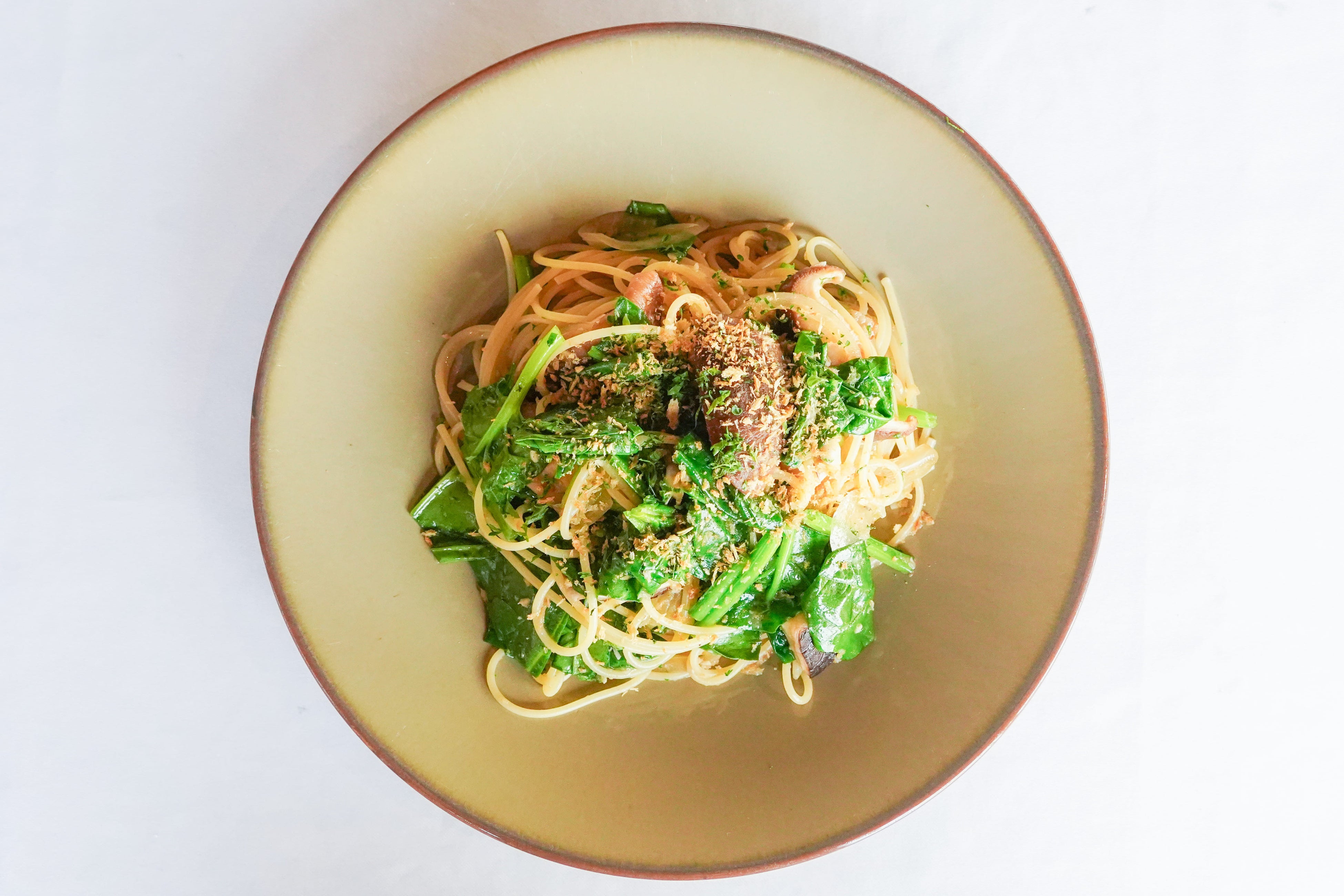 アンチョビとにんにくをしっかり効かせ、栄養たっぷりの無農薬ほうれん草と山口県美祢市産の原木椎茸を楽しむシンプルなペペロンチーノ。