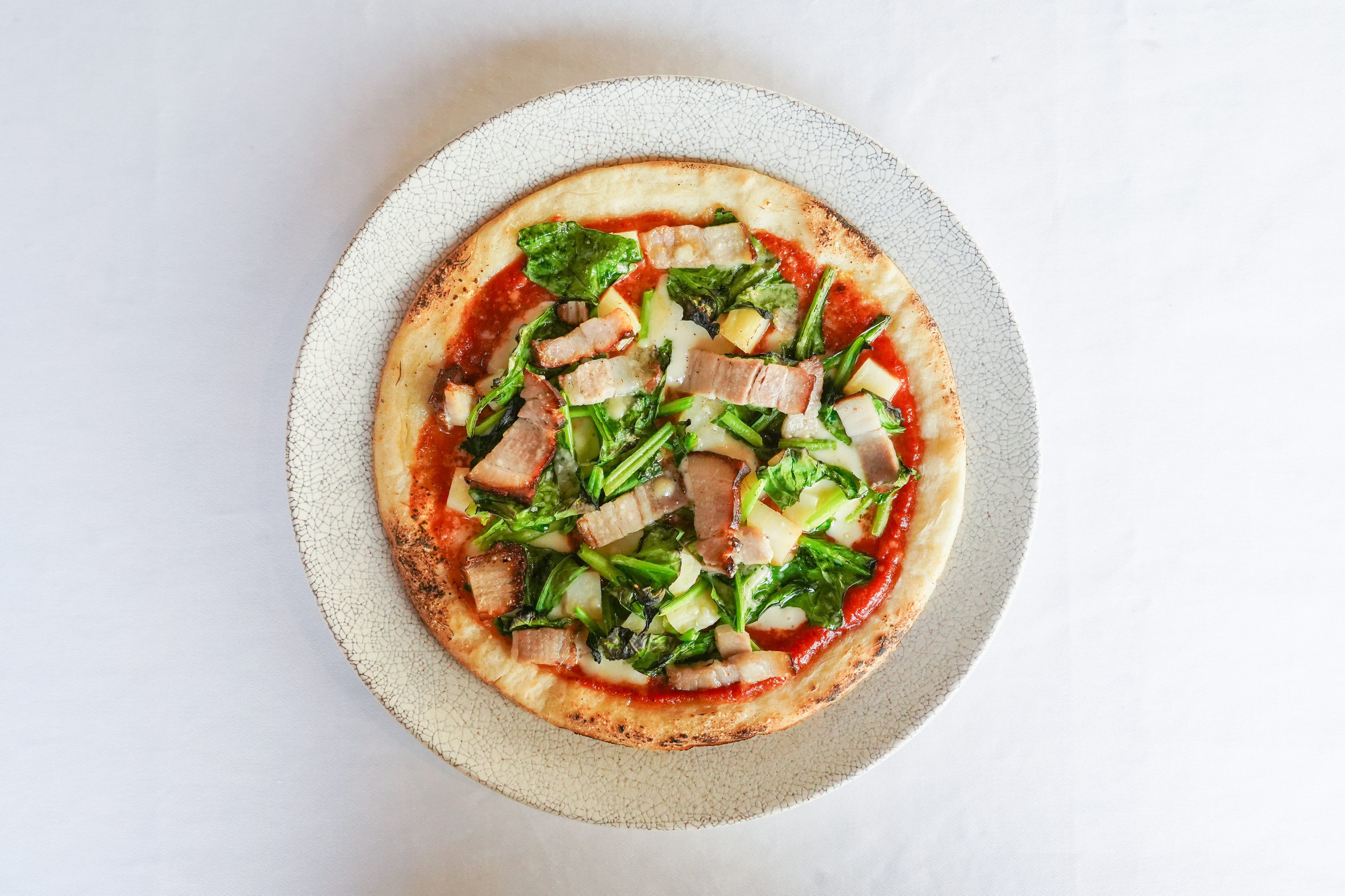 旨みたっぷりの自家製ベーコン、ホクホクのじゃが芋、旬のほうれん草をトッピングした冬限定のピザ。