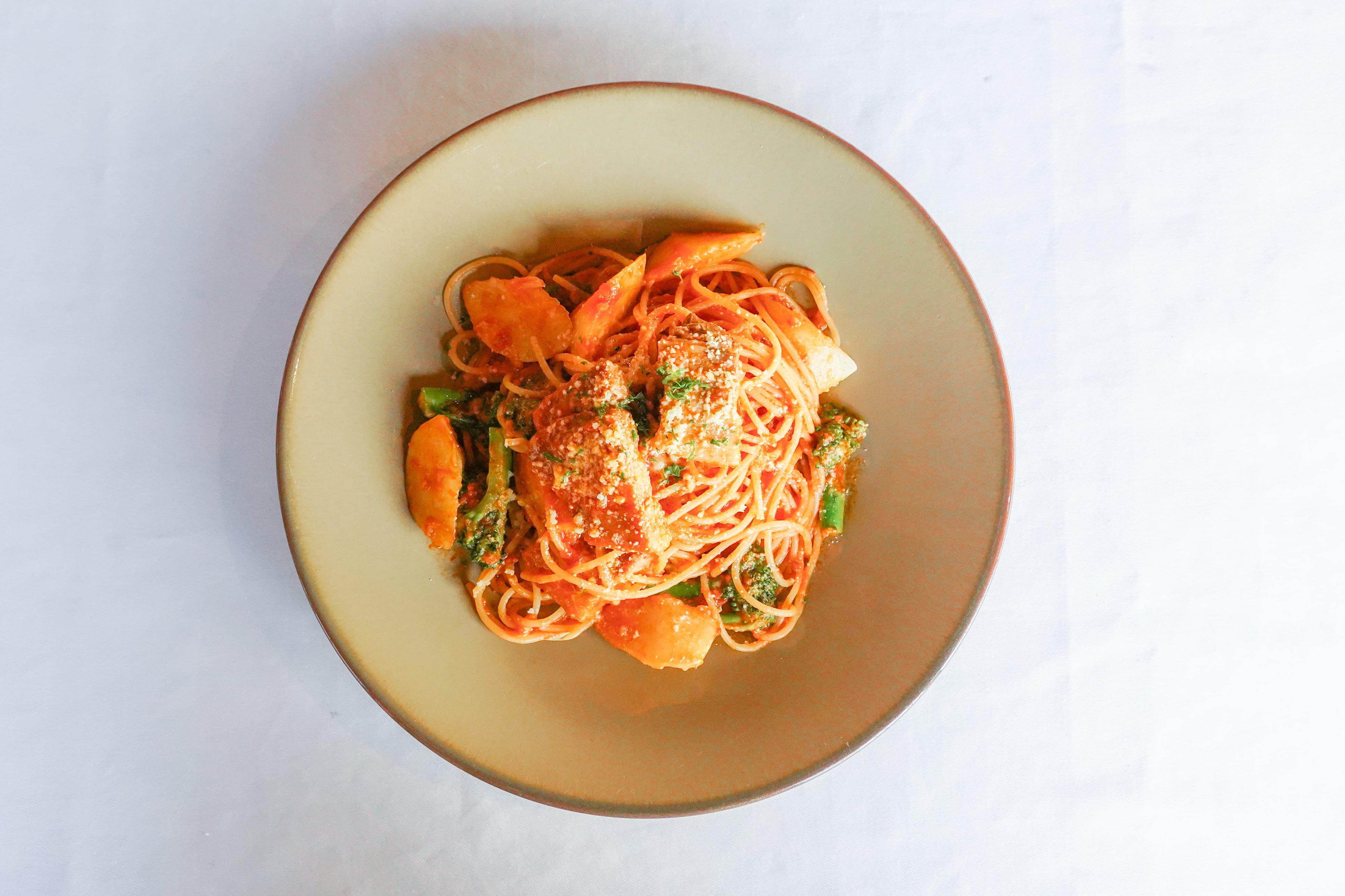 とろけるように柔らかく蒸した豚バラ肉と、旬の蕪・ブロッコリーがごろっと入って食べ応え抜群のパスタ。コクのあるトマトソースと冬野菜の甘みがやさしく広がります。パンとの相性もGOOD☆