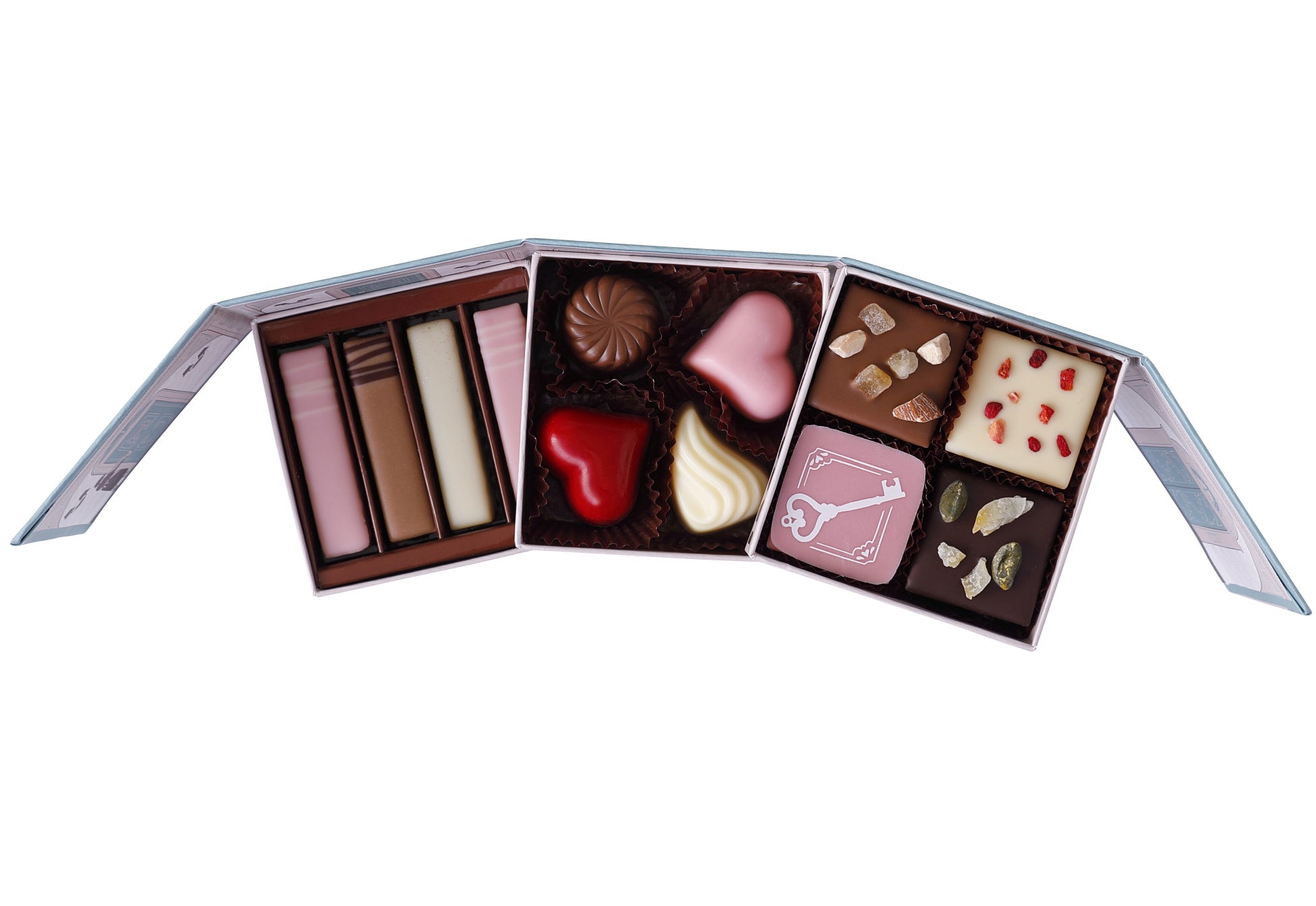 限定ショコラ「キャレショコラ」「ブシェショコラ」「バトンショコラ」を、3段ボックスに詰め合わせました。とっておきのショコラが勢ぞろいです。
