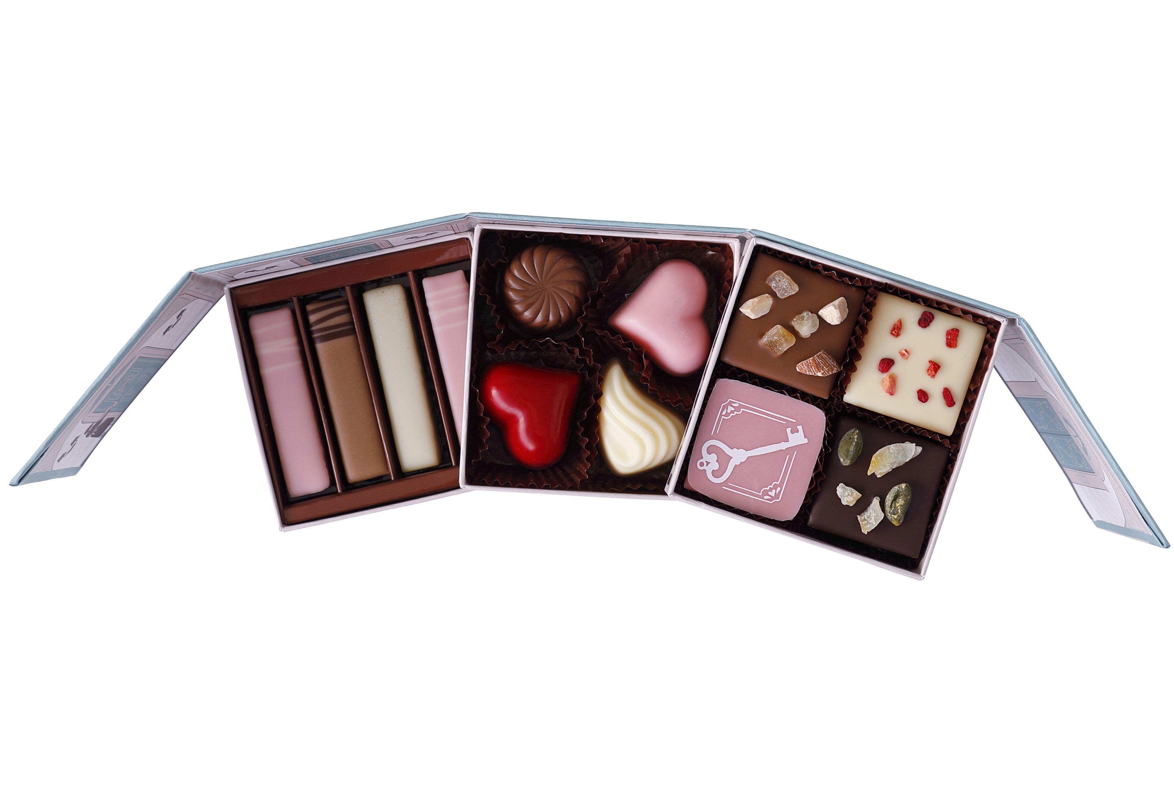 キャラメル:バーガンディカラーのハートのスイートチョコレートには、キャラメルクリームをとじ込めました。
