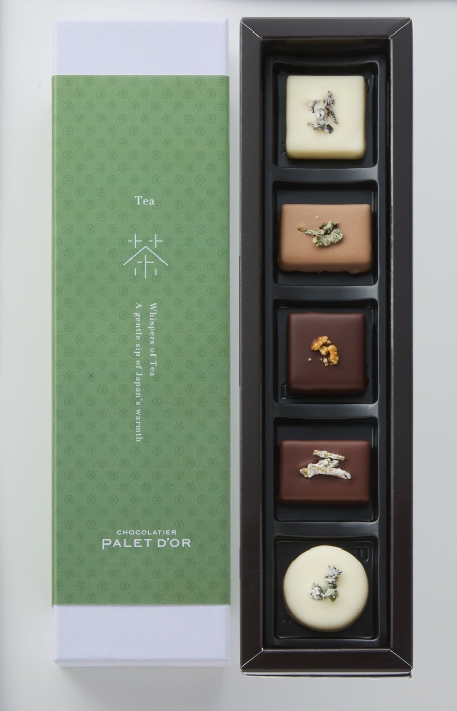 「日本のおいしさ探求」がテーマのコレクションBOX。日本各地で生産されるお茶の中から、静岡県・カネロク松本園の烏龍茶、三重・伊勢宇治園の伊勢茶、京都・柳櫻園の玄米茶、石川・丸八製茶場の加賀棒茶、愛知の西尾抹茶を厳選し、カカオ豆から丁寧に作り上げた自家製チョコレートを、それぞれのお茶に合わせてブレンド。素材の個性を大切にし、お茶とカカオが調和する繊細な風味のショコラに仕上げました。口どけとともに豊かな香りと奥行きのあるふくよかな甘みが広がる、日本のお茶の魅力を堪能する詰め合わせです。カカオ豆の搾油まで手掛け、ホワイトチョコレートさえも自家製で作るショコラティエ パレドオールだからこそ引き出せる味わい。大切な方への贈り物や自分へのご褒美ショコラとしておすすめの、ゆったりと心和むショコラをお楽しみください。