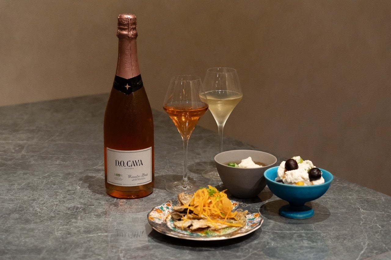 前菜からメインまで自在に合わせられる、熟成期間の幅が広いカバ。カバ・デ・グアルダ・スーペリオール・レセルバ(最低18か月熟成)は、 熟した果実、アニス、トースト香を思わせるニュアンスが感じられる、より奥行きのある味わいが特長です。コクのある料理や、風味の強いメニューと美しく調和します。 カバ・デ・グアルダ・スーペリオール グラン・レセルバは、 瓶内で30か月以上熟成され、複雑で重層的な香りと、きめ細かく非常に上質な泡立ちを備えています。 高級料理はもちろん、日常の料理においてもその魅力を存分に発揮する一本です。 そして頂点に位置するのが、カバ・デ・グアルダ・スーペリオール・パラヘ・カリフィカード。 単一畑のブドウのみを使用し、36か月以上の熟成を経て造られるこのカバは、 テロワールの究極的な表現であり、カバ原産地呼称(DO)の卓越性を体現する存在です。長期熟成を含む多彩なスタイルを持つカバだからこそ、出汁や砂糖、酢を使用した日本食とも相性が良く、今回はその魅力を体感いただける3つのペアリングメニューをご用意しました。