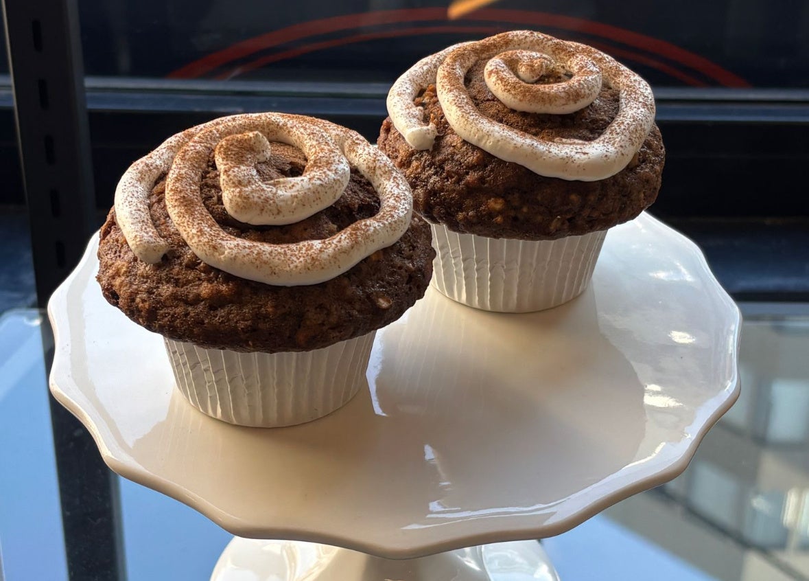 アメリカンベイクの定番、シナモンロールをマフィンで表現。ふわふわの生地にたっぷりのシナモンシュガーフィリングと、薫り高い挽きたてのコーヒーを混ぜ込みました。ほろ苦いコーヒーの風味と、甘いクリームチーズトッピングの相性は抜群!シナモンロールを思わせる渦巻き模様も注目です!