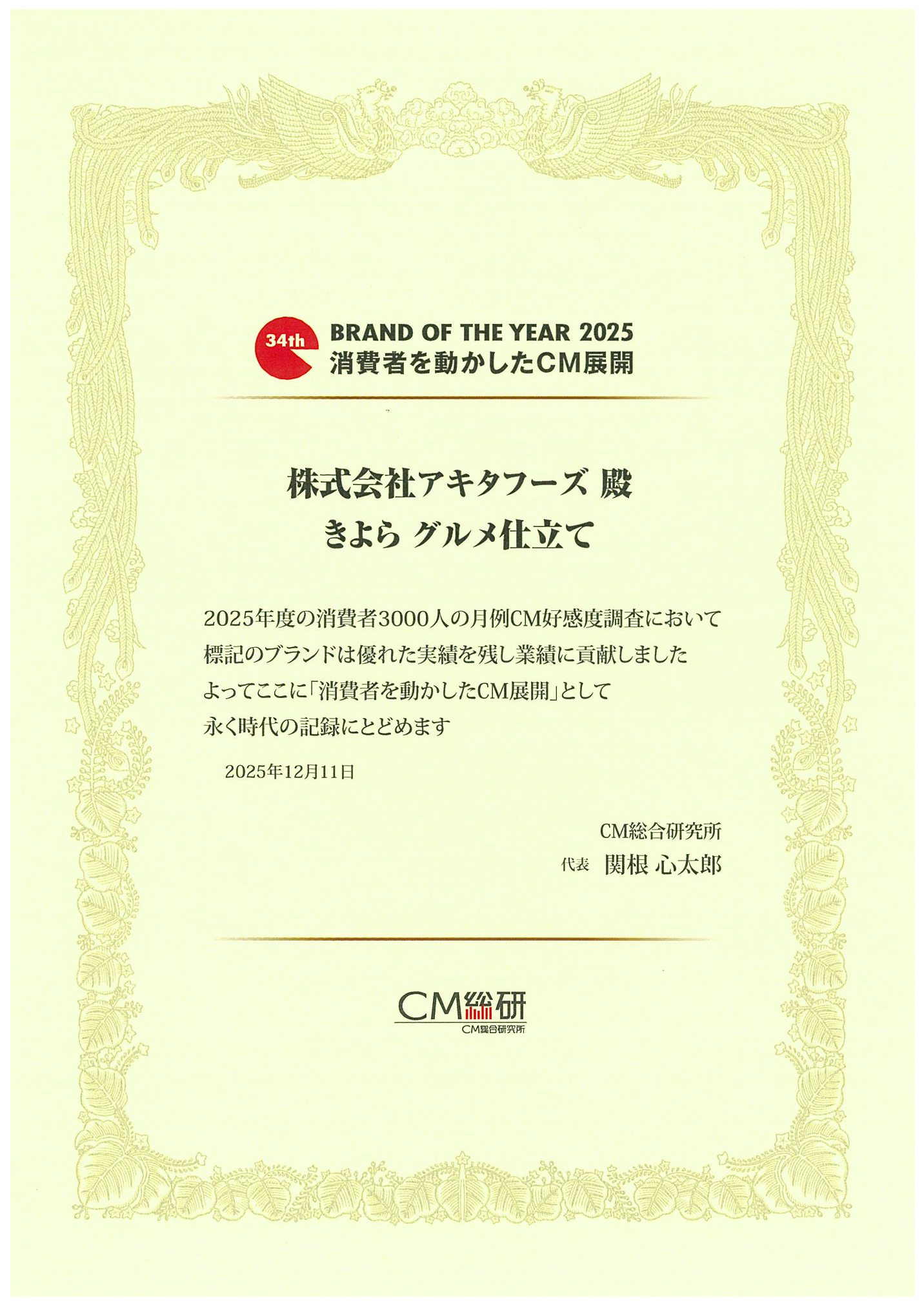 高品質・高付加価値の卵「きよら グルメ仕立て」の開発販売を行う株式会社アキタフーズ(本社:広島県福山市、代表取締役社⻑ 秋田正吾、 以下アキタフーズ)は、 「きよら グルメ仕立て」のテレビCMが株式会社東京企画 CM総合研究所の主催する「BRAND OF THE YEAR 2025 消費者を動かしたCM展開」に入賞したことをお知らせします。
