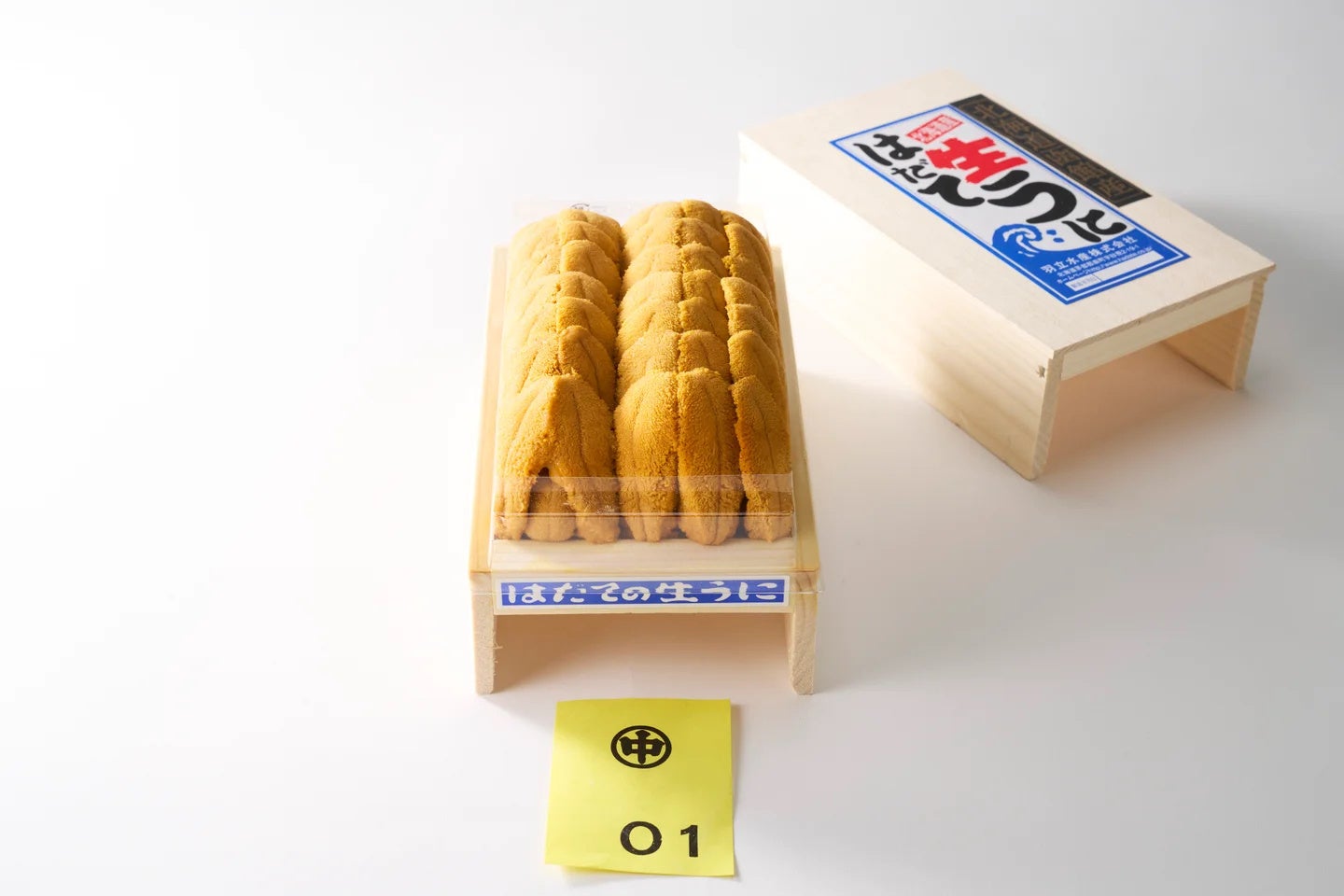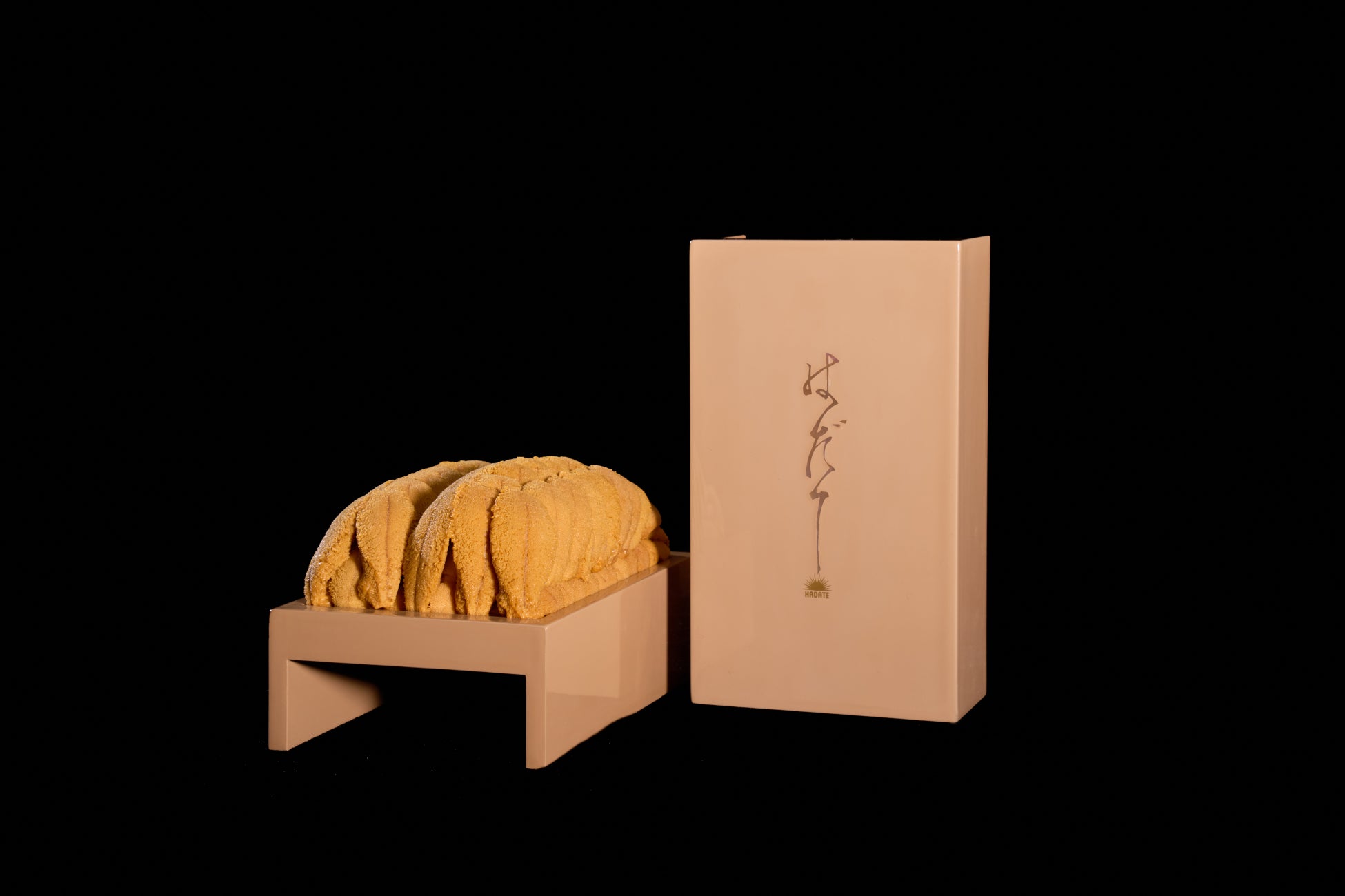 北海道から直送される『はだての生うに』は東京の豊洲魚市場でも最高値で取引され、ミシュランの星を獲得した人気店を含む多くの老舗寿鮨店で使用されています。「生うに 暁」は、羽立水産が年間扱う生うにのうち、わずか1%しか獲れない極上の生うに原料を使用しています。うに詰め人 羽立咲子による高い技術を要する手詰めで一つ一つ作る、色良し・味良し・仕立て良しの三 拍子揃った逸品となっています。
