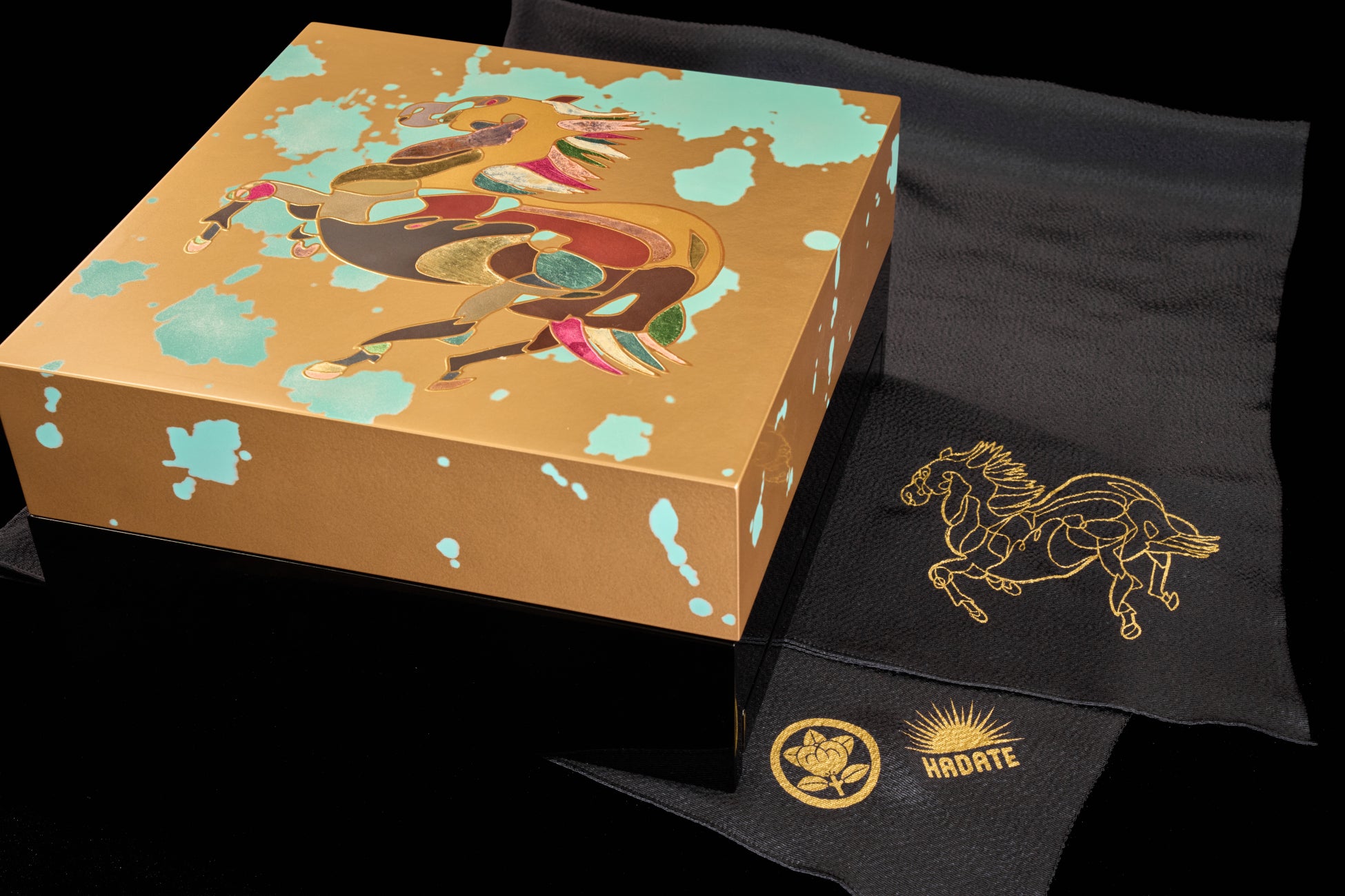 今にも駆け出しそうな干支の馬は、国内外で活躍する美術家 Nao Morigo が新年の祈りと希 望を込めて描き下ろしたアートワークをもとに、漆琳堂が日本の伝統工芸である蒔絵の技法で表現し、「生うに 暁」専用の木製総漆塗り箱~午~として制作しました。風を受けて靡く馬の立て髪や尾には贅沢に箔を施し、生命力あふれる勢いを象徴的に描出。背景には、Nao Morigo作品の特徴である湧き上がる緑青の青を、漆ならではの深みと艶で忠実に再現しています。