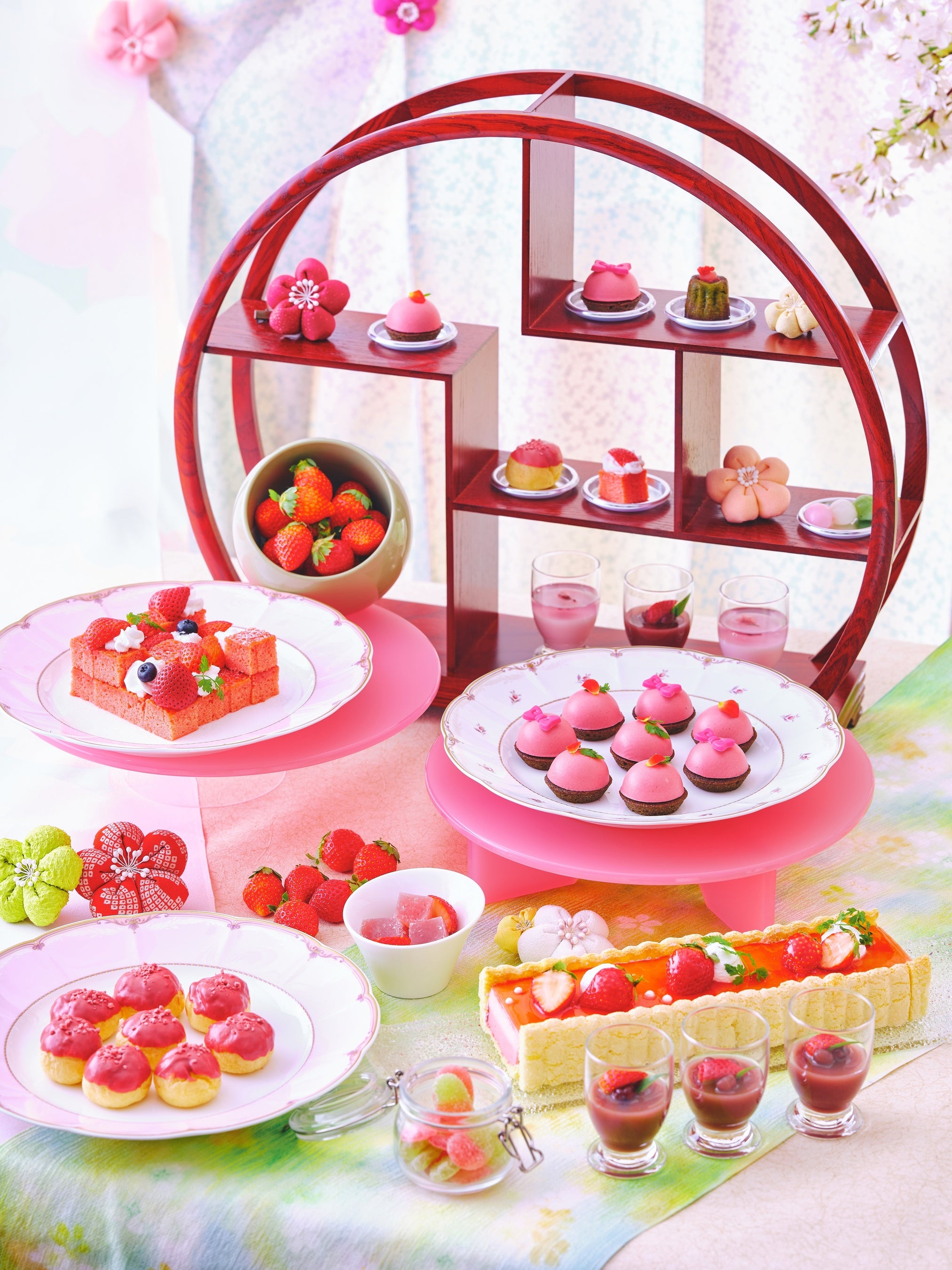 旬のいちごの甘酸っぱさと、さくらのやさしい香りが重なり合う、華やかに彩られた和洋のスイーツを多彩にご用意。また、店内装飾を京都手描友禅協同組合の協力の下、和の雰囲気に演出します。京都の伝統を感じながら、この春だけの特別なハーモニーをお楽しみください。