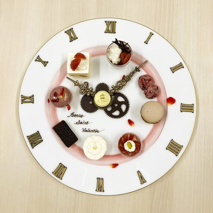 この時季だけの時計塔をイメージしたスウィーツ、「ミナルディーズ」。上から時計回りに、小さなカップに入ったチョコレートムース、酸味のきいたピンク色のロッシュ(ルビーショコラ&クランベリー)、チョコレートマカロン、イチゴタルト、フロマージュ クリュ、アールグレイ風味のフィナンシェショコラ、アロマ ルージュ、フレージェが並びます。