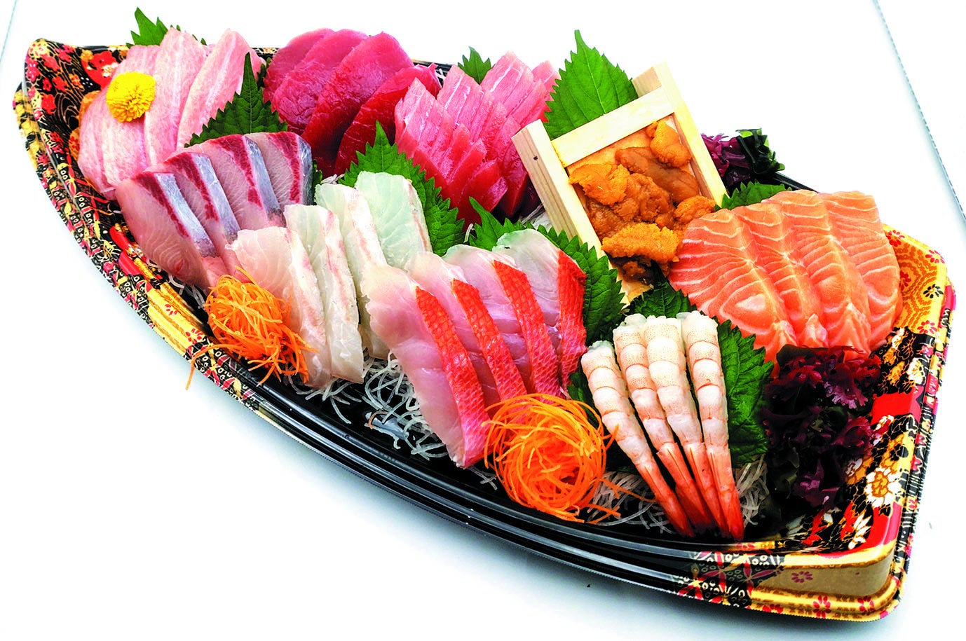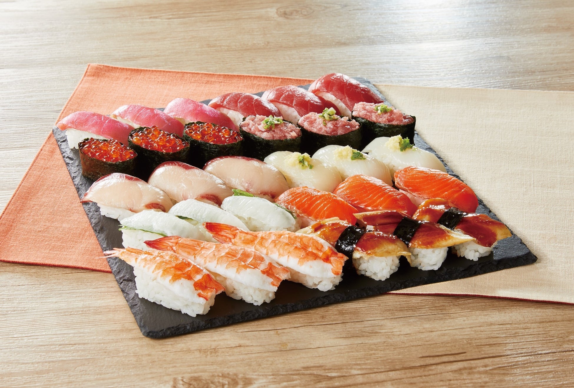 生本まぐろ大とろ・中とろ・赤身をはじめ、ブリ、ヒラメ、うに、生アトランティックサーモン、金目鯛、えびといった9種の刺身を豪華な盛り合わせに仕上げています。(実施期間、ネタは店舗によって異なります。実施していない店舗もあります)