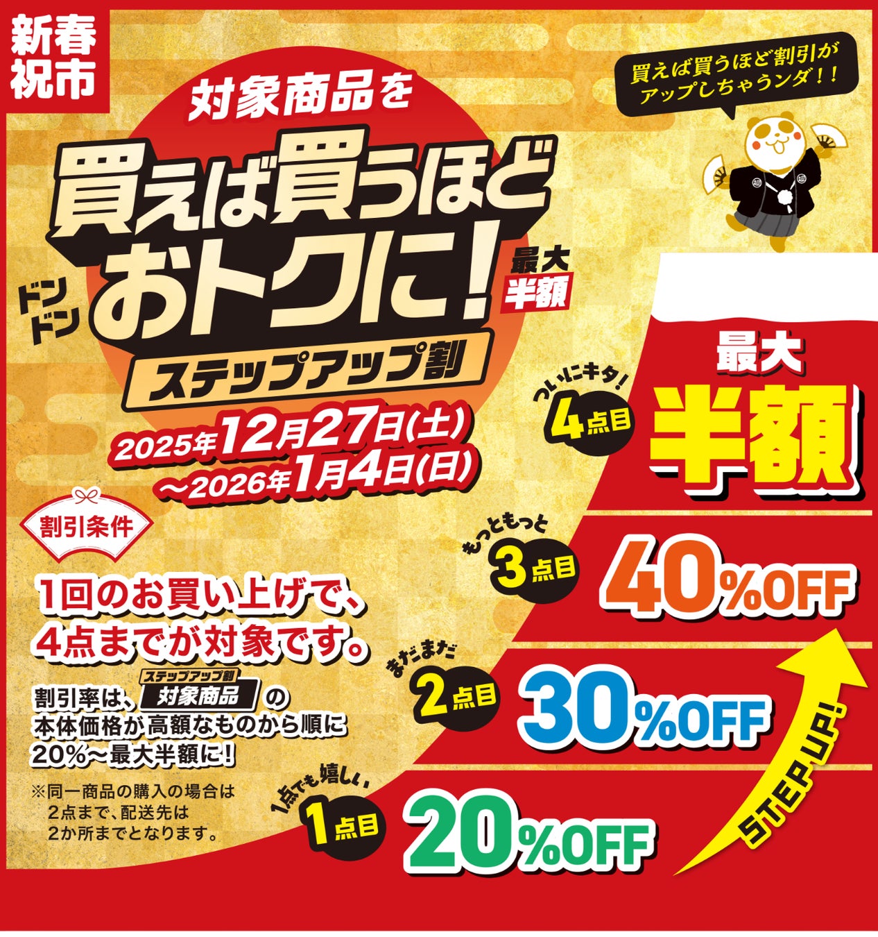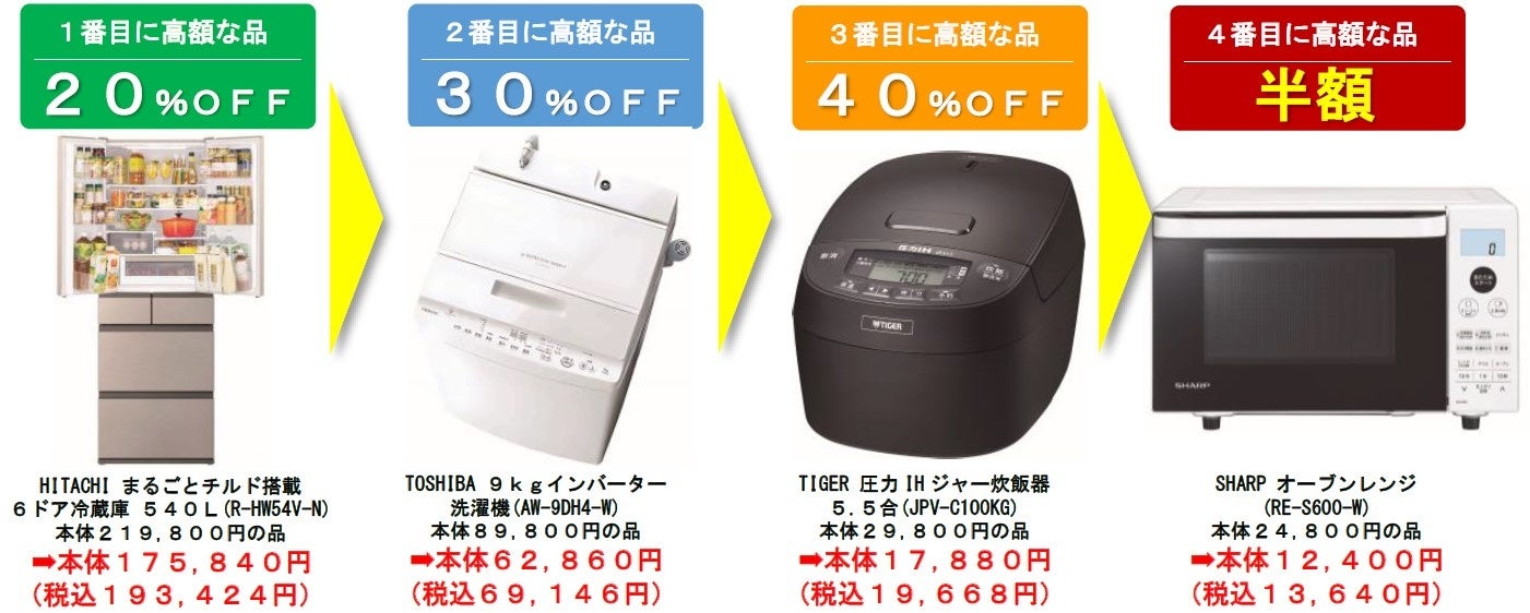 人気商品からオリジナル商品まで全177品目の家電や暮らしの品を対象に、購入点数に応じて割引率が1点目2割引➡4点目半額にステップアップする、買えば買うほどお得なお年玉企画です。