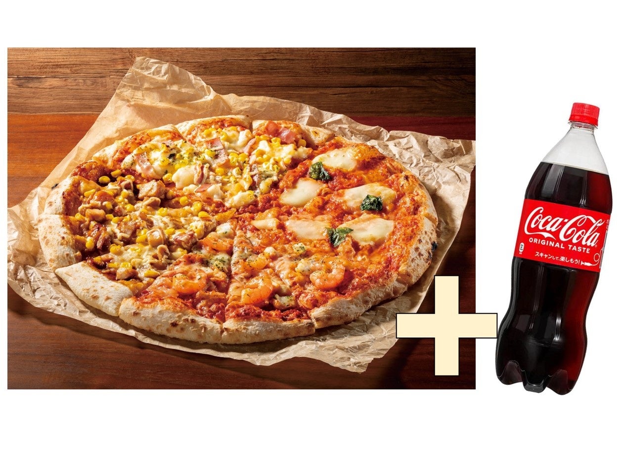 「ポテトべ-コン」「てりやきチキン」「マルゲリータ」「シーフード」の4種の味が1枚で楽しめる、通常の1.4倍・約35cmのホールLサイズなど、「ピッツァソリデラ」のピッツァの購入でコカ・コーラ1本がもらえる無料引換券を進呈します。(ホールLサイズ購入で1,500ml、ホールレギュラーサイズ購入で700mlを進呈/なくなり次第終了)