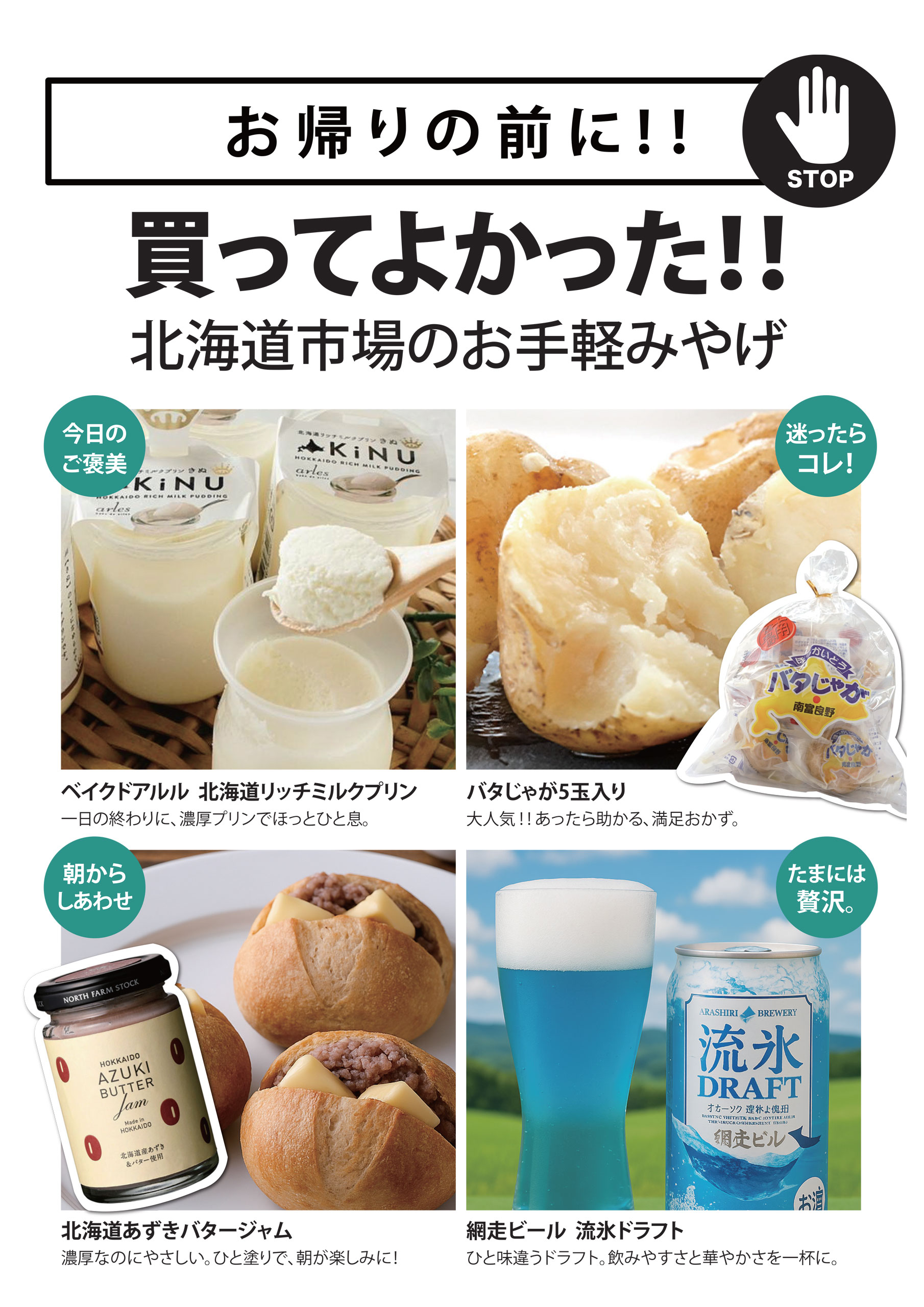 蟹からスイーツまで、北海道の美味しさを一度に楽しめる市場です。