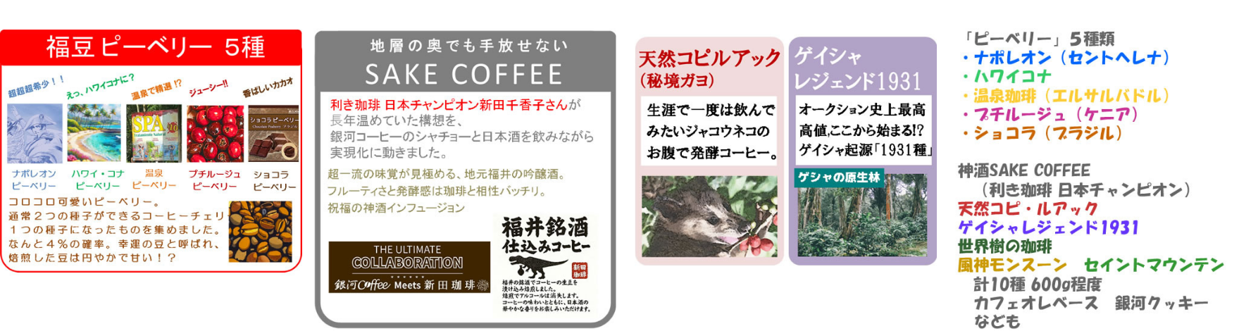 5種類の希少なピーベリー(ナポレオン、ハワイコナ等)に加え、日本チャンピオン新田千香子氏が作る銀河コーヒー「神酒SAKE COFFEE」など計11種(約630g)。