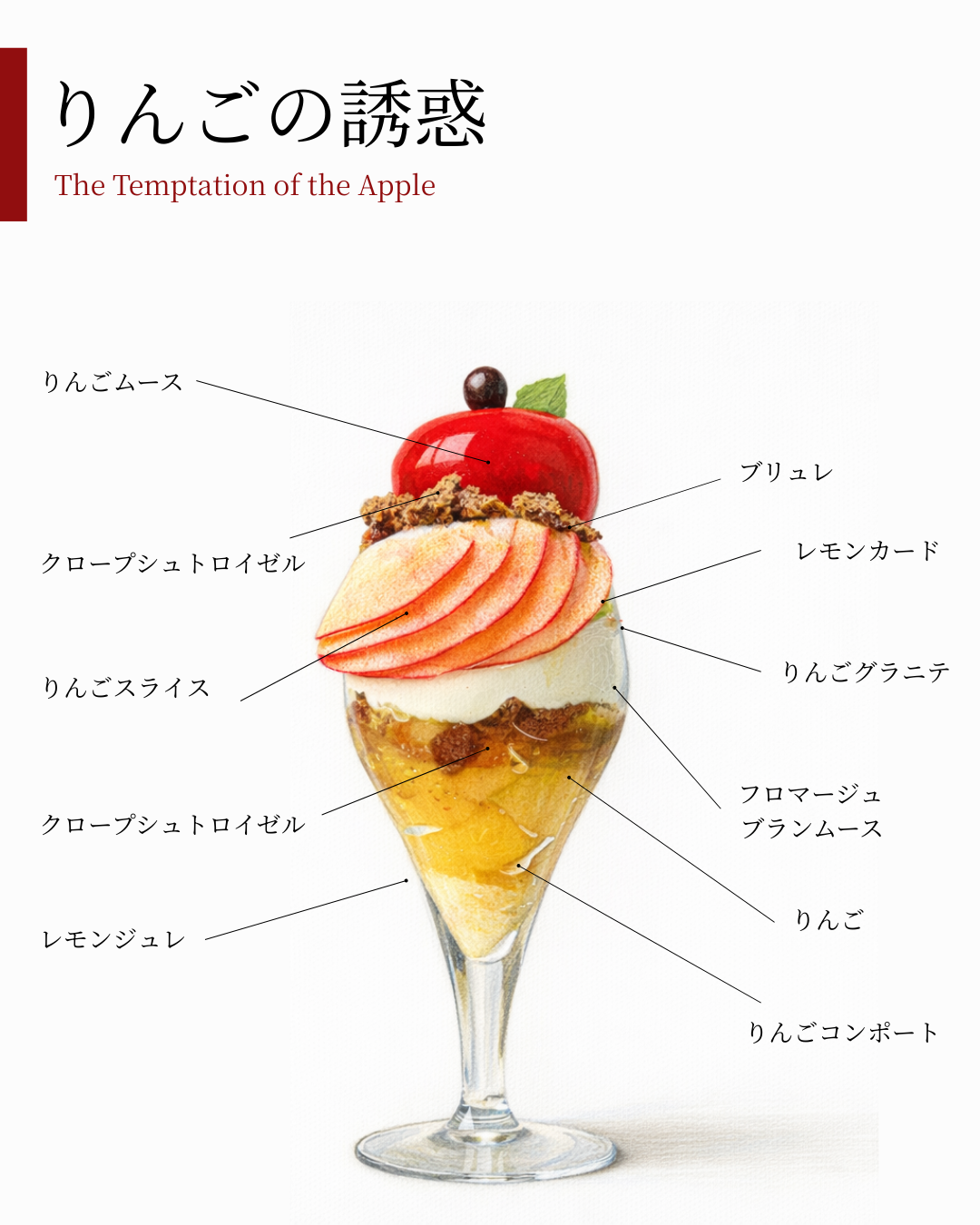 「りんご」という親しみのある果実を、どこまで洗練させられるか。今回のパフェは、“最後まで食べ飽きない構成” がテーマ。りんごの甘み・酸味・香りの多彩な表情を味わえるよう、コンポート、ムース、グラニテなど、仕立てを変えて丁寧に重ねています。ひと匙ごとに表情を変える冬限定パフェをお楽しみください。