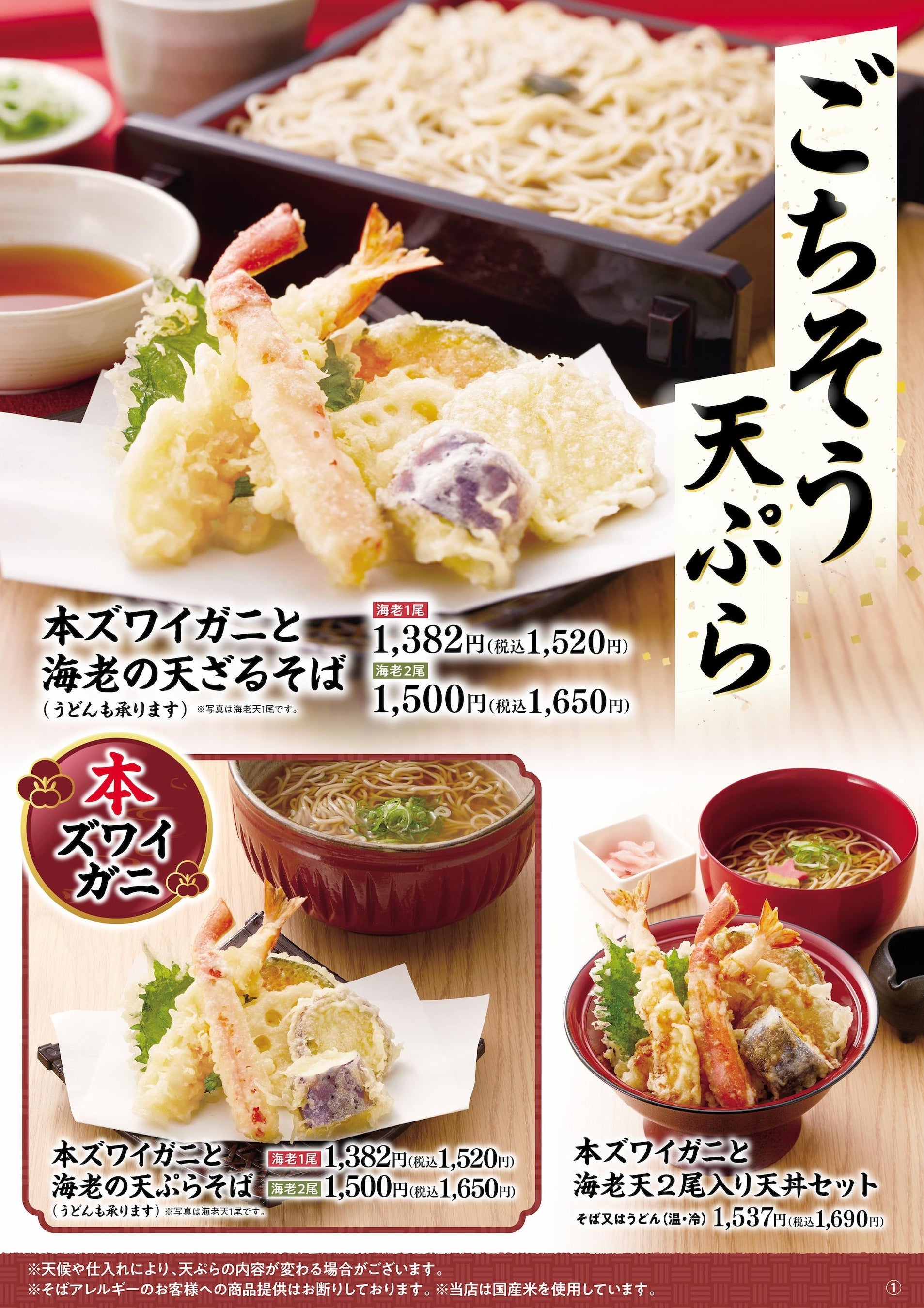 本ズワイガニと海老の天ぷらそば(海老2尾)1,650円(税込)