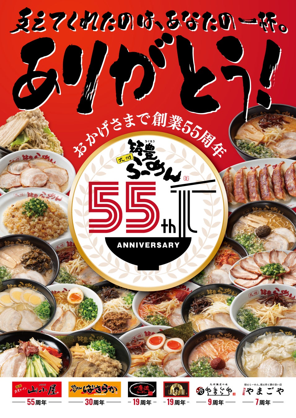 ラーメンチェーン「九州筑豊ラーメン山小屋」を展開するワイエスフード株式会社(本社:福岡県田川郡香春町、代表取締役社長:高田十光、証券コード:3358、以下 当社)は、創業55周年を記念し、イオン九州株式会社(本社:福岡市東区、代表取締役社長:中川伊正、以下 イオン九州)が実施する人気企画「九州ご当地企業コラボ」に参加しています。