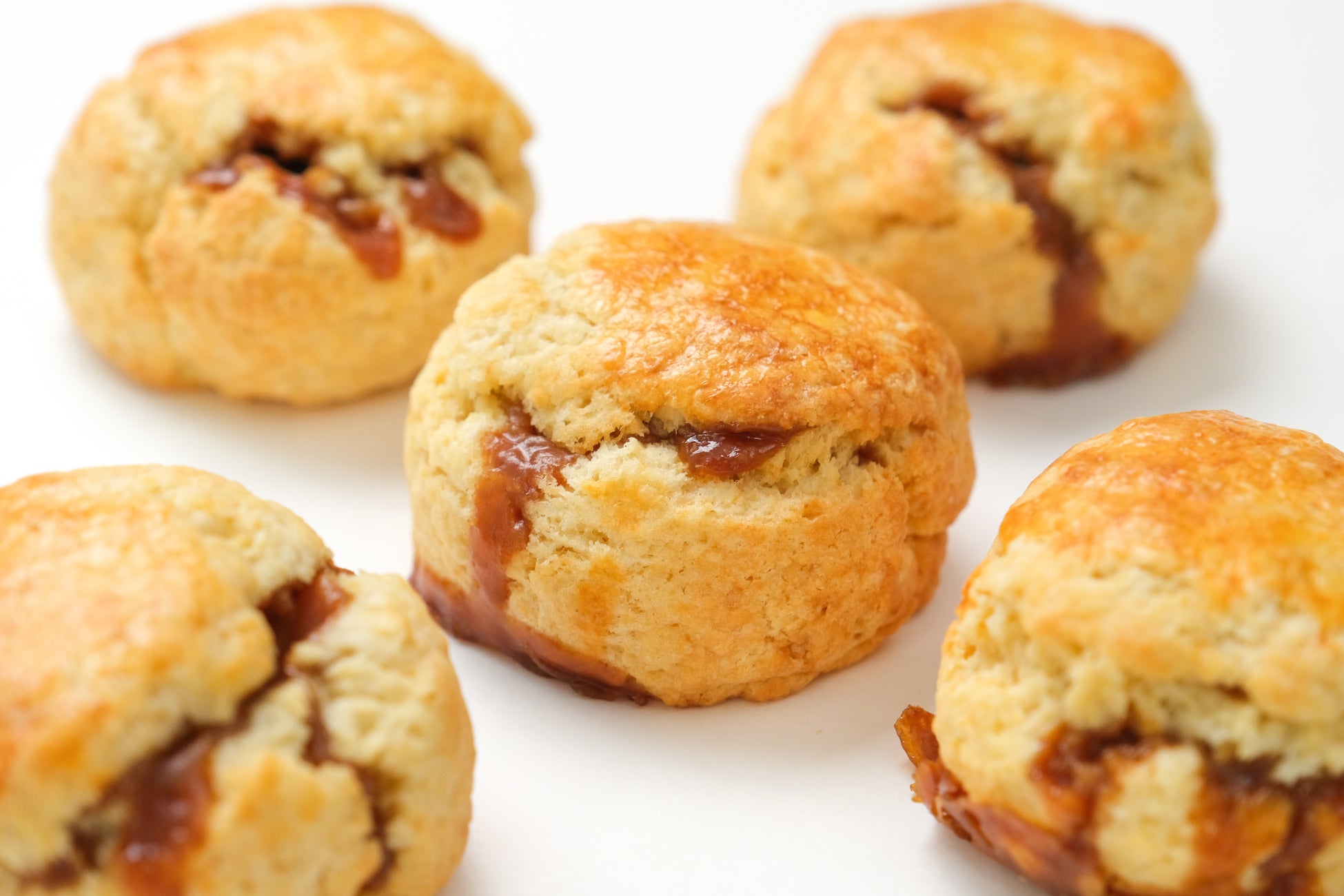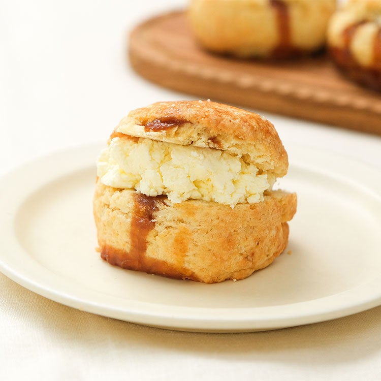 北海道産小麦とバター、徳之島産のきび砂糖など、厳選した国産素材を使用したしっとり食感のスコーンに、工房で丁寧に手作りしたキャラメルを挟みました。 キャラメルは、スコーンから流れ出してしまわないよう、ほどよく「ねっちり、とろり」とした心地よい固さと食感にこだわって仕上げています。トースターでほんのちょっぴり温めると、キャラメルが柔らかく溶け出し、生地の香ばしさと溶け合う至福の味わいをお楽しみいただけます。