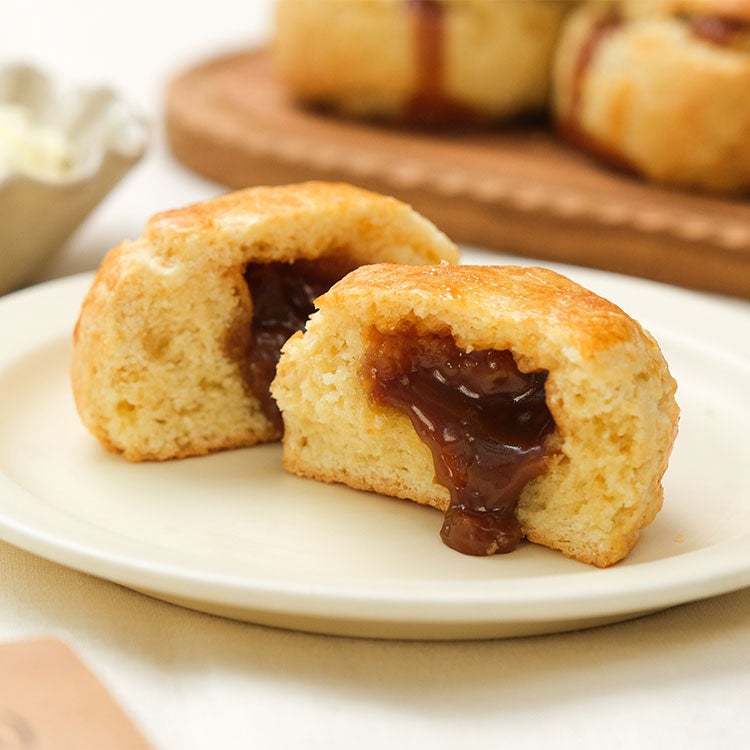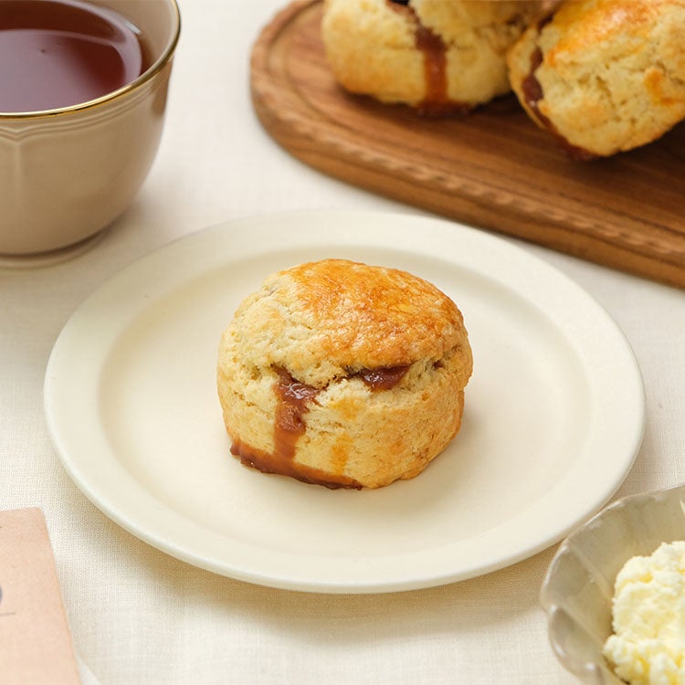北海道産小麦とバター、徳之島産のきび砂糖など、厳選した国産素材を使用したしっとり食感のスコーンに、工房で丁寧に手作りしたキャラメルを挟みました。 キャラメルは、スコーンから流れ出してしまわないよう、ほどよく「ねっちり、とろり」とした心地よい固さと食感にこだわって仕上げています。トースターでほんのちょっぴり温めると、キャラメルが柔らかく溶け出し、生地の香ばしさと溶け合う至福の味わいをお楽しみいただけます。