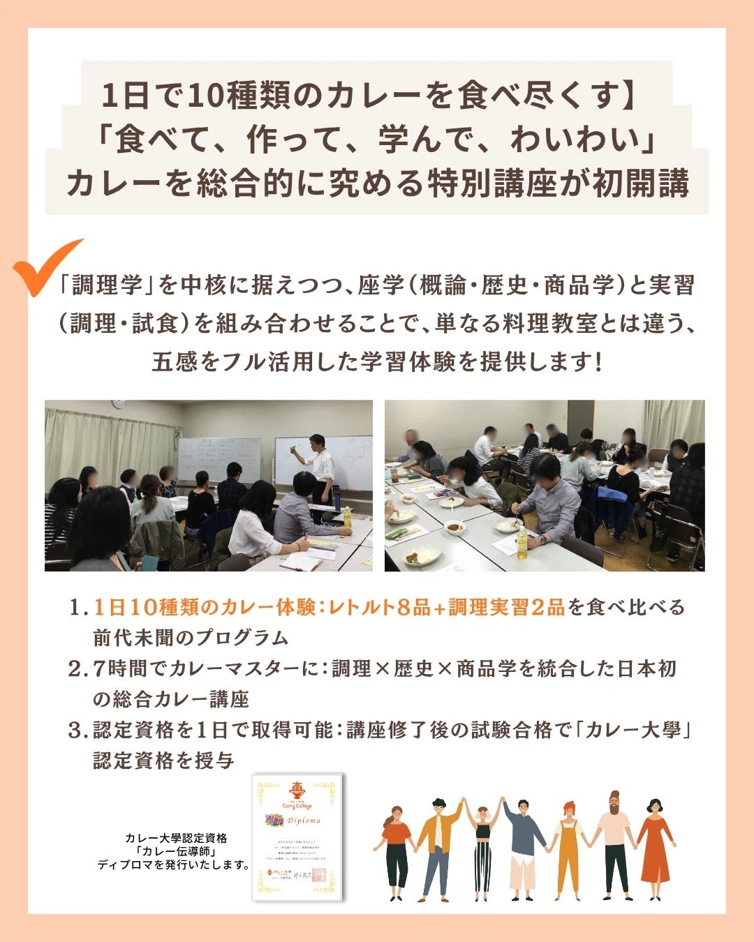 【3つの注目ポイント】①1日10種類のカレー実習&試食の体験する前代未聞のプログラム、②7時間でカレー専門家になる調理×歴史×商品学を統合した総合カレー講座、③認定資格「カレー伝導師」を1日で取得可能