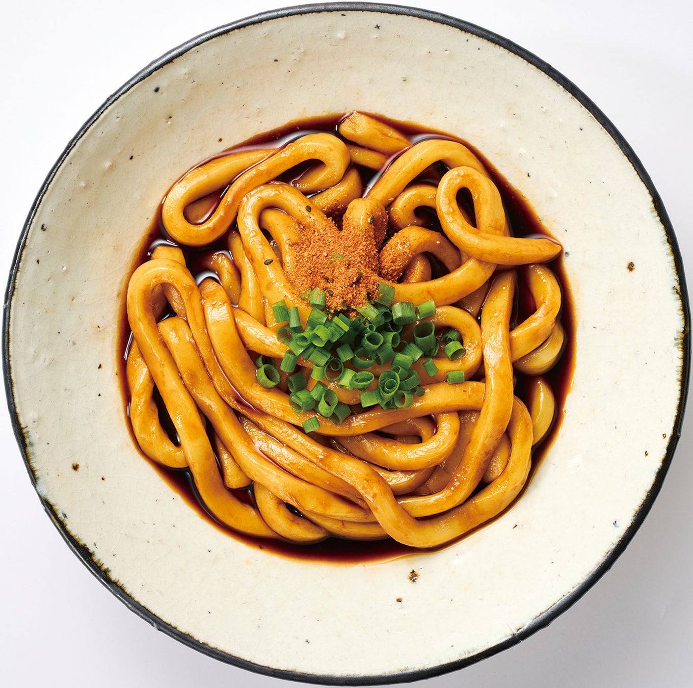 たまり醤油にカツオだしを加えた甘辛いタレが絡む、柔らかいもちもち麺。