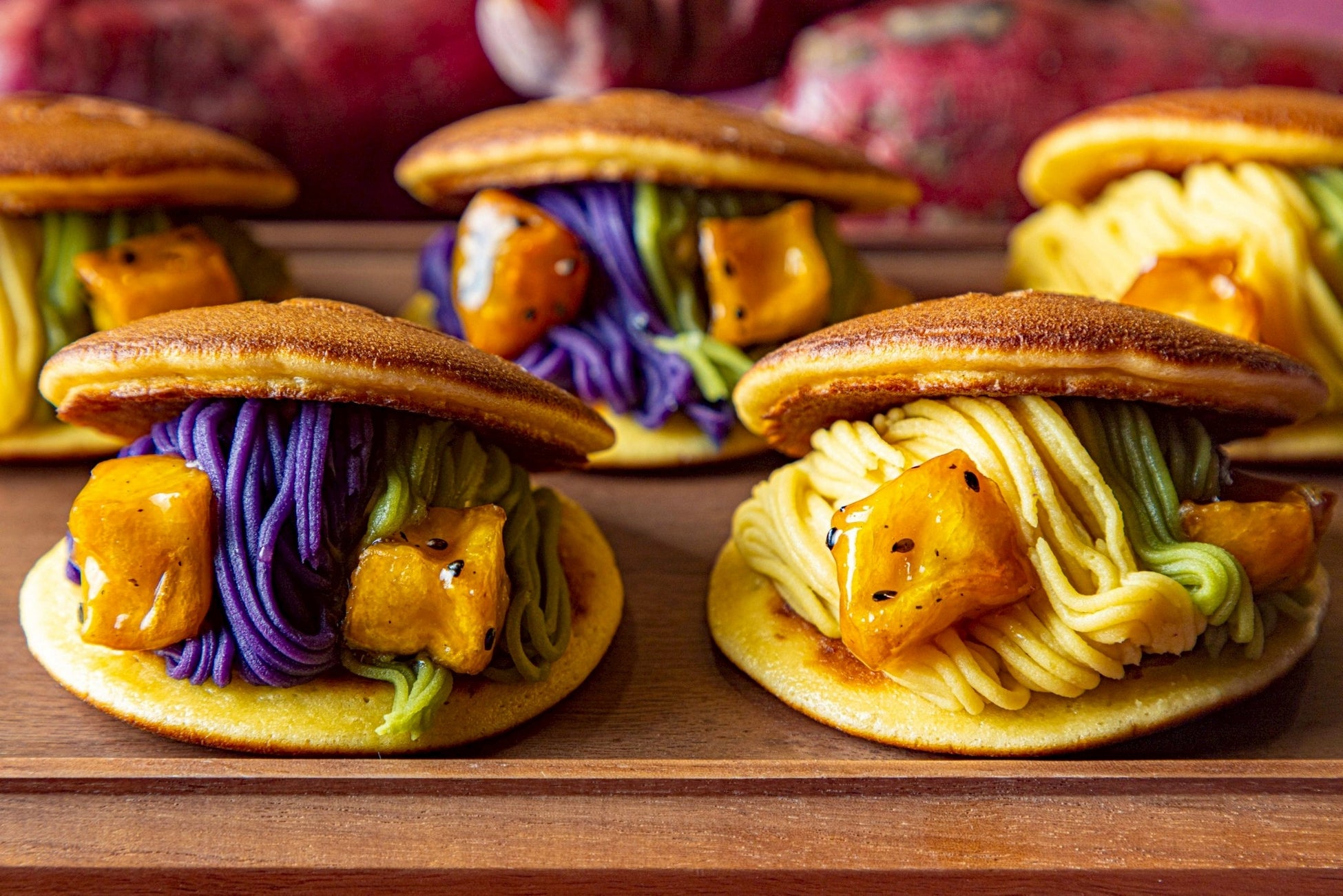 〈福井〉お芋スイーツ専門店フランダースフリッツ/抹茶&焼き芋の2層モンブラン生どら焼き[紅芋、シルクスイート](各1個)801円