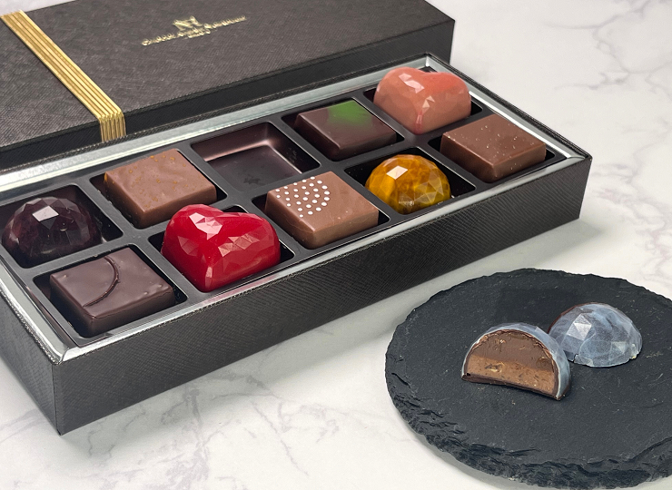 なめらかなガナッシュ、とろりと流れるキャラメル、果実味のあるコンフィチュールやナッツのプラリネが層になったボンボンと、ひと口ごとに表情の違う味わいが広がりをお楽しみいただけます。見た目の華やかさと、本格的な味わいが揃った、贈り物にもぴったりです。