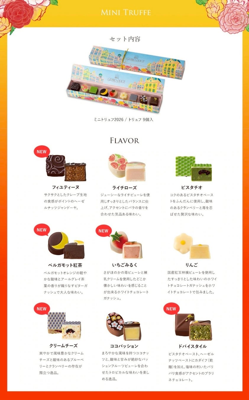 ベルギーのグランプラス広場とフラワーカーペットをモチーフにしたボックスに、好評のフルーツフレーバーに、話題のドバイスタイル等、新作5種類が加わった9種類のセット。