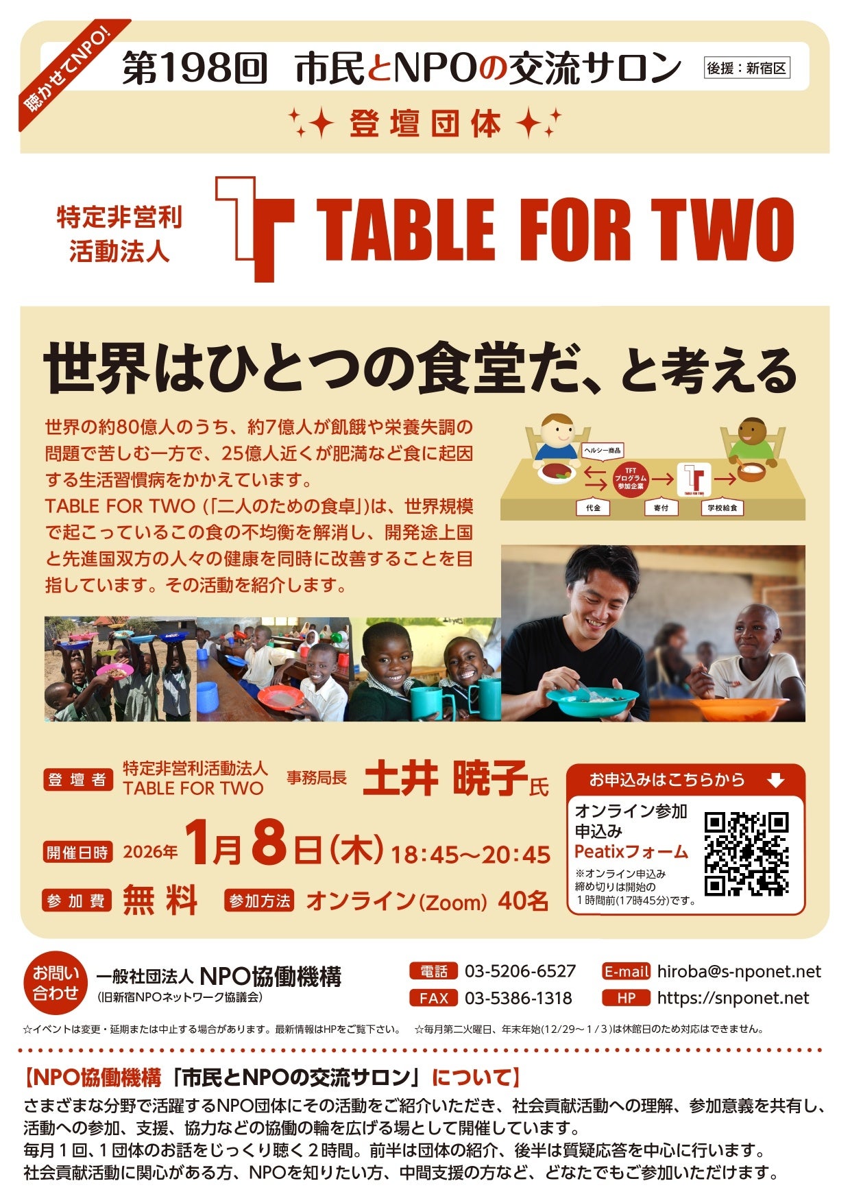 【第198回 市民とNPOの交流サロン(オンライン・イベント)(登壇団体:NPO法人 TABLE FOR TWO)を1月8日(木)に開催します!絶賛、参加者募集中です‼