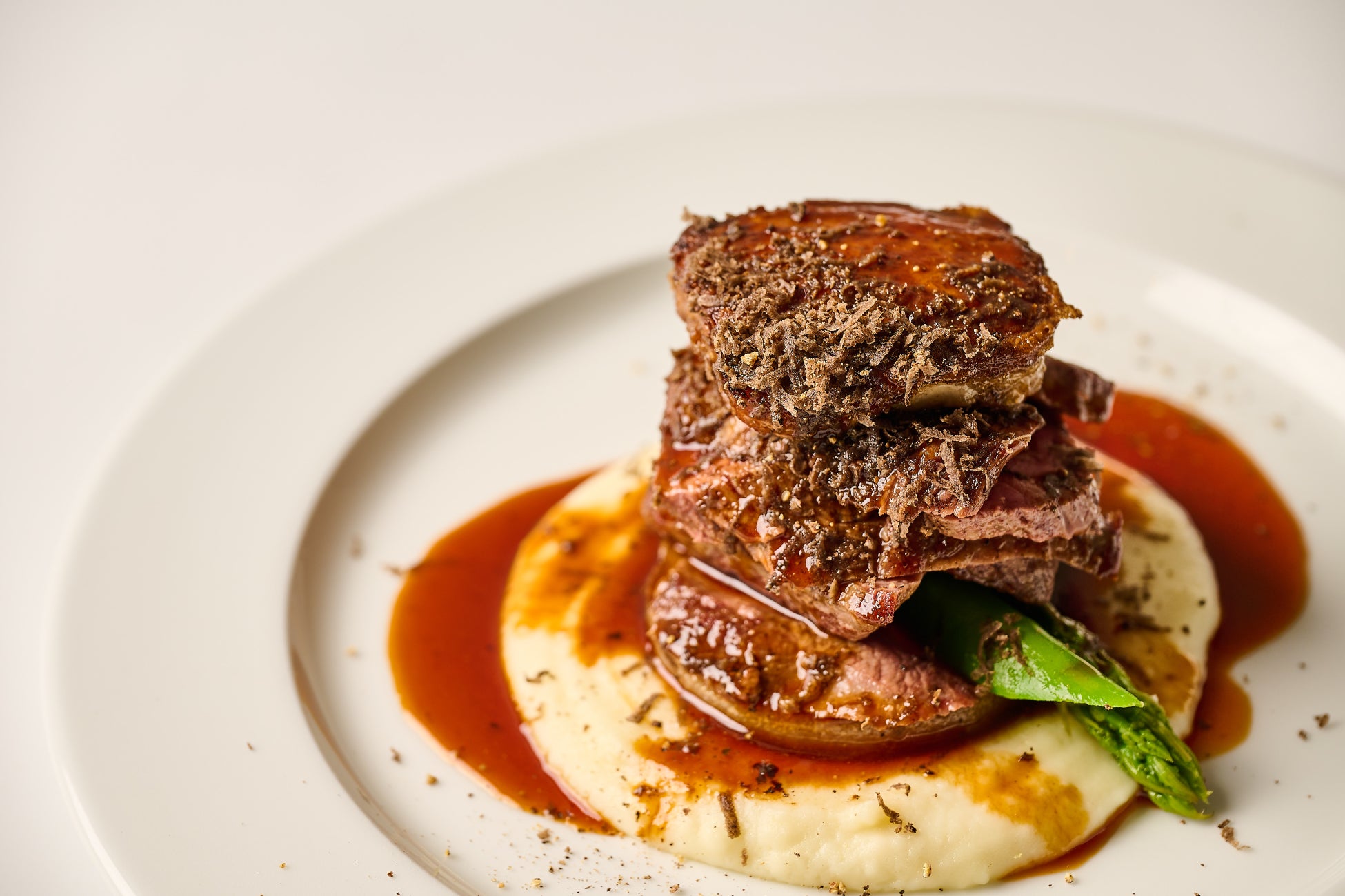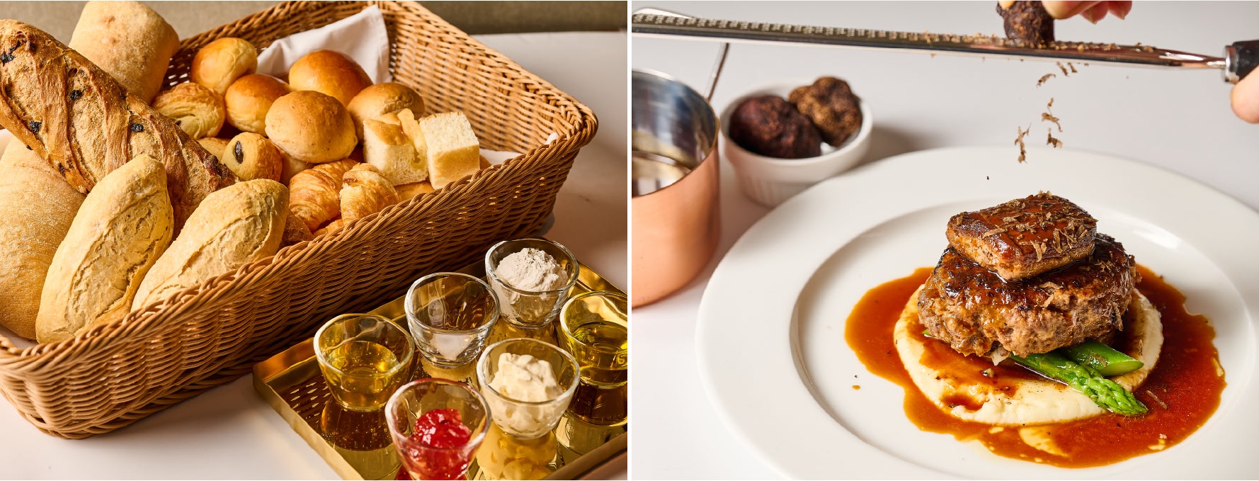 メインの主役は、黒毛和牛の旨味を存分に味わえる「黒毛和牛のハンバーグステーキ ロッシーニ風」と「リブロースのステーキ ロッシーニ風」。濃厚なフォアグラテリーヌと黒トリュフを合わせ、仕上げのソースとトリュフスライスはお席で施します。ライブ感あふれる贅沢な一皿をご堪能ください。