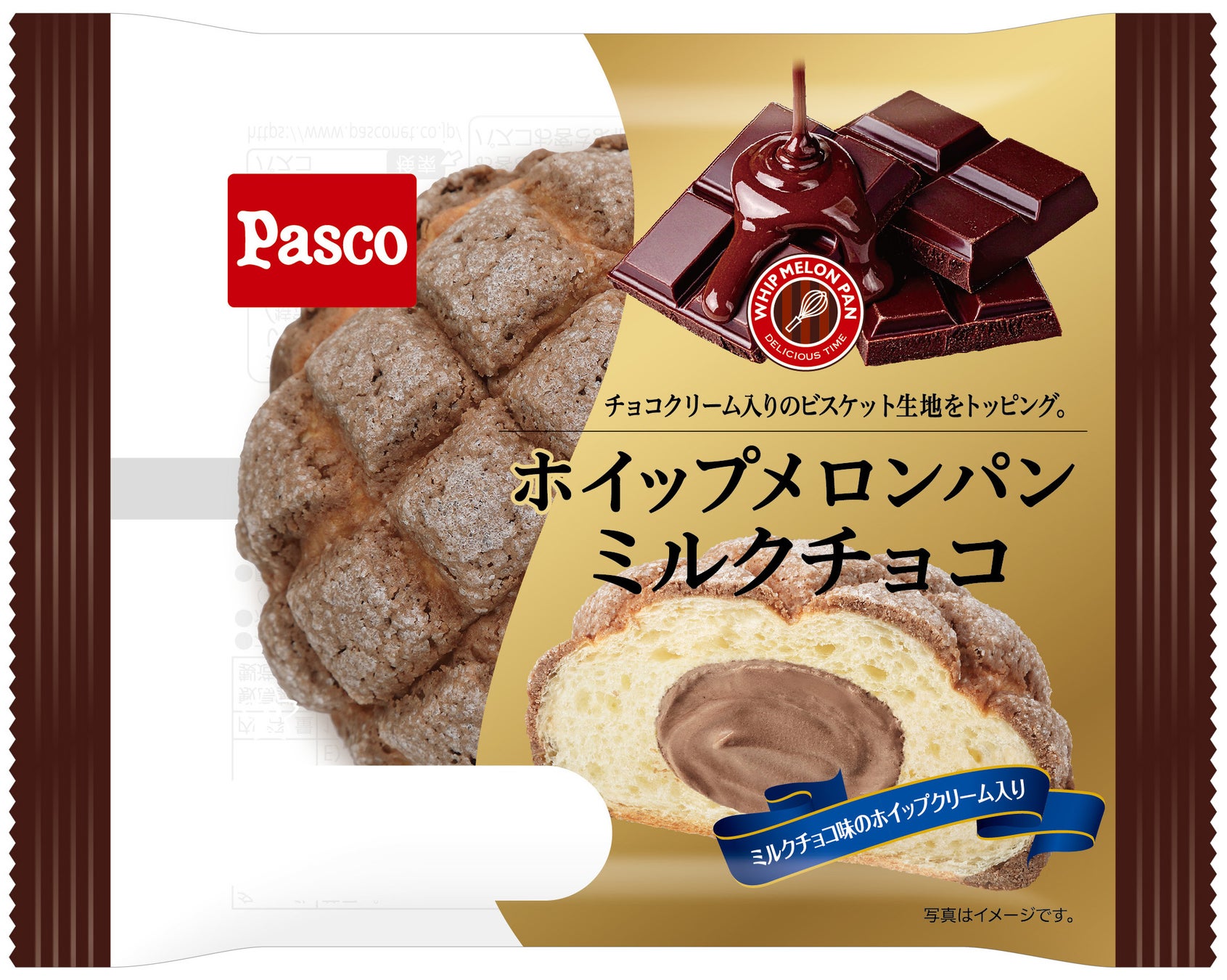 人気のホイップメロンパンシリーズの新商品です。チョコクリーム入りのビスケット生地をトッピングしたメロンパンに、チョコホイップクリームを入れました。