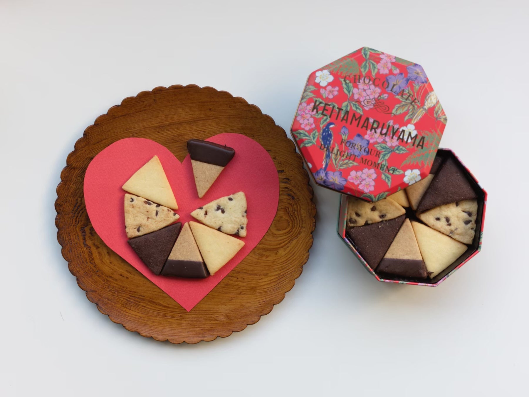 華やかな赤を基調とした花鳥柄のアーカイヴデザインを使用した八角形の缶に、三角型のクッキー5種を美しく詰め合わせました。小さすぎず大きすぎない程よいサイズ感で、開けた瞬間の華やぎと特別感を楽しめる一缶に仕上げています。