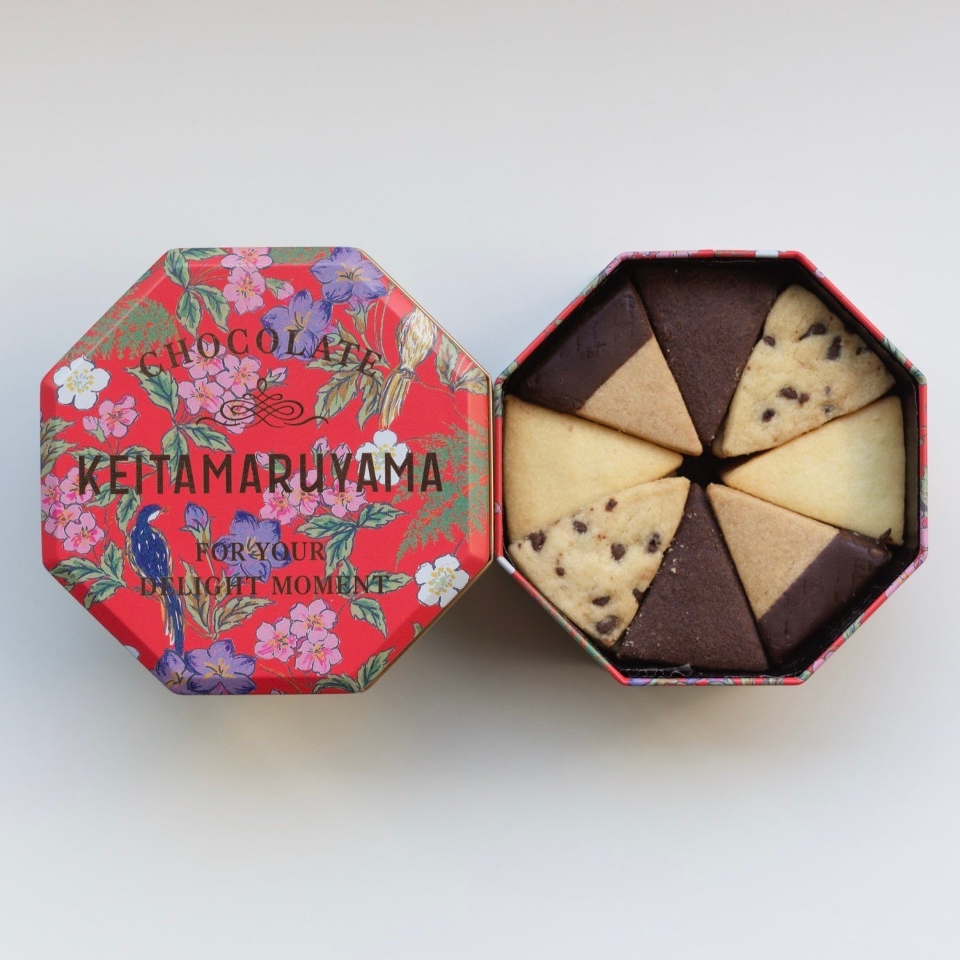 華やかな赤を基調とした花鳥柄のアーカイヴデザインを使用した八角形の缶に、三角型のクッキー5種を美しく詰め合わせました。小さすぎず大きすぎない程よいサイズ感で、開けた瞬間の華やぎと特別感を楽しめる一缶に仕上げています。