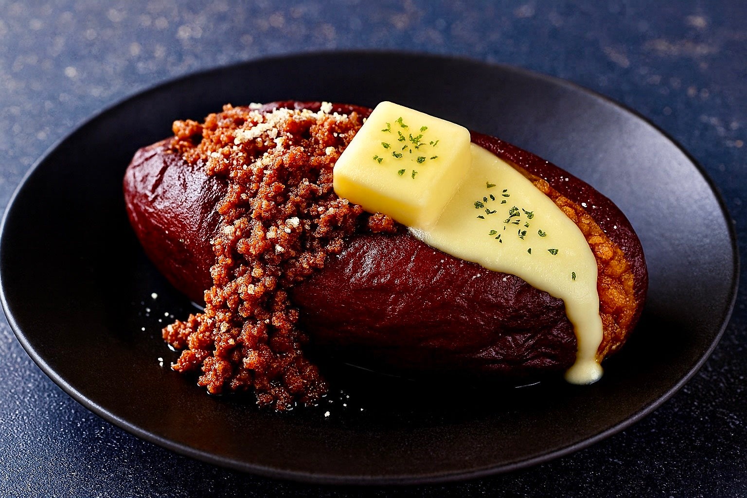 柔らかく煮込んだ旨辛チキンに甘くとろける焼き芋とチーズを重ねた、やみつきの一品です。