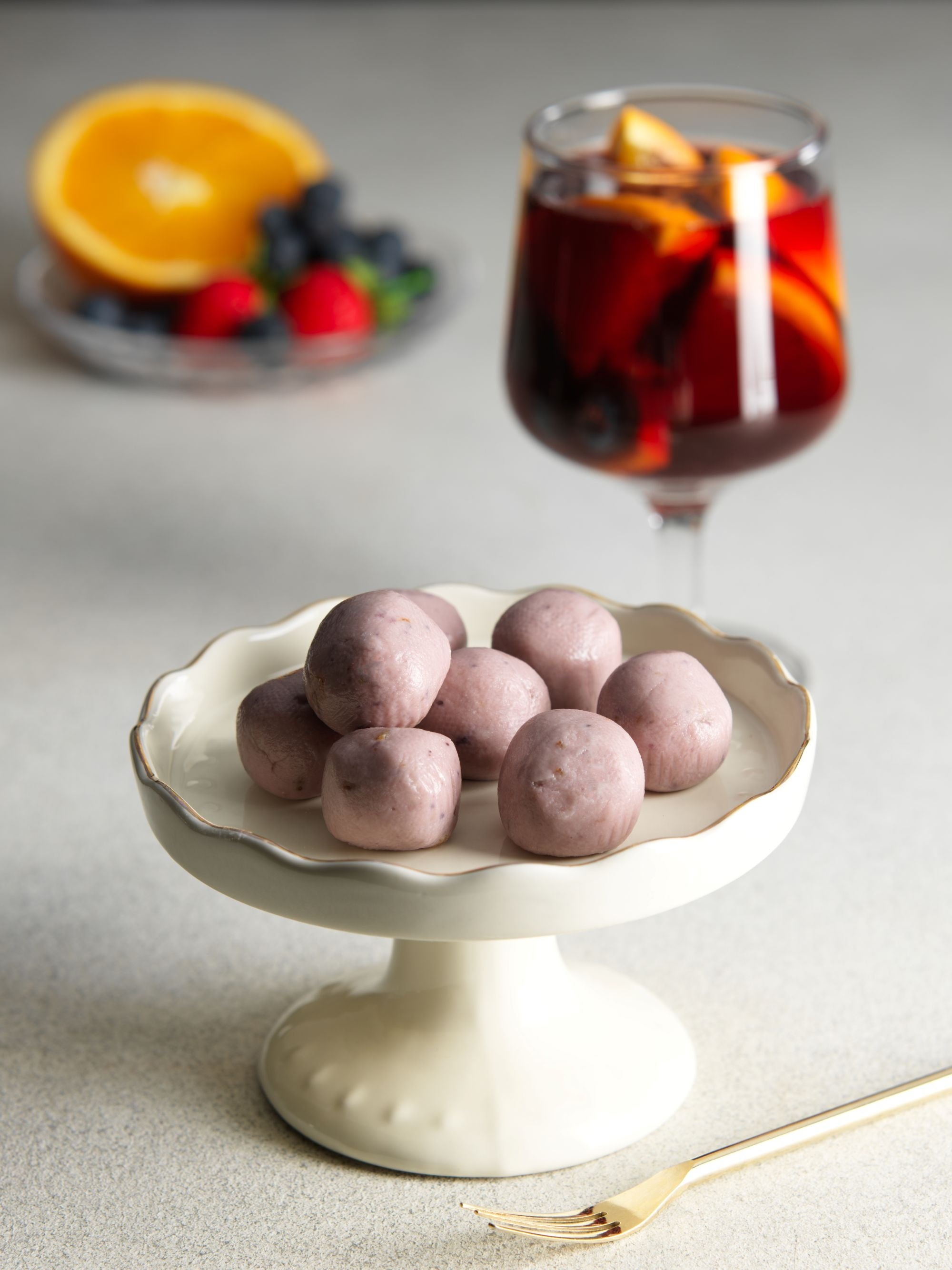 赤ワインやフルーツを合わせ「サングリア」をイメージした芳醇なチョコレート。北海道産のぶどうを使用した赤ワインの上品な香りと、ミルキーな北海道産生クリームが調和した赤ワインガナッシュに、赤ワインに漬け込んだオレンジピールやドライ苺、ドライブルーベリーなどを合わせ、さわやかな酸味や甘みを演出。最後まで華やかな余韻がお楽しみいただけます。