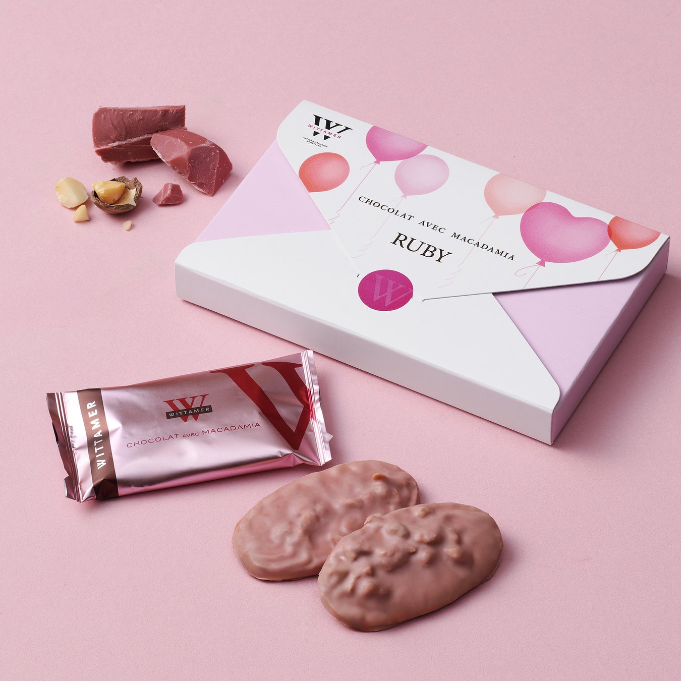 サクサクの食感に焼き上げたサブレにマカダミアナッツとアーモンドをのせ、チョコレートでコーティングしたヴィタメール一番人気の焼き菓子「マカダミア・ショコラ」。毎年人気の小箱シリーズがリニューアルしました。自分用のおやつとしてはもちろん、ちょっとした贈り物に最適な手紙型のパッケージ。スマートなパッケージはまとめ買いにもおすすめです。定番の“ミルク”と“ダーク”に期間限定の“ルビー”の3つの味をご用意しました。