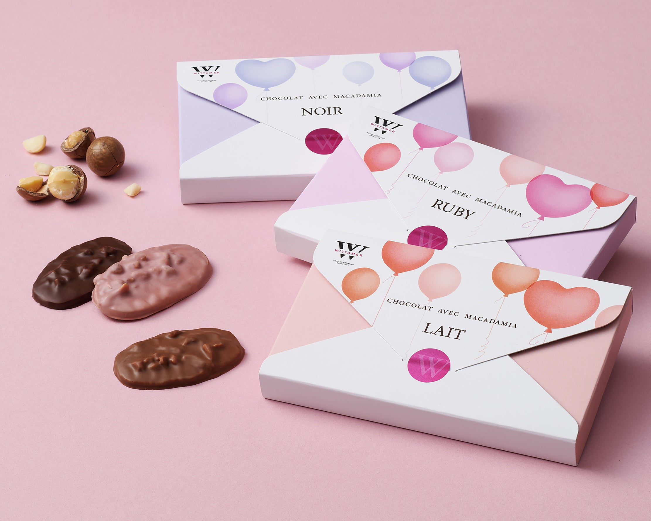 サクサクの食感に焼き上げたサブレにマカダミアナッツとアーモンドをのせ、チョコレートでコーティングしたヴィタメール一番人気の焼き菓子「マカダミア・ショコラ」。毎年人気の小箱シリーズがリニューアルしました。自分用のおやつとしてはもちろん、ちょっとした贈り物に最適な手紙型のパッケージ。スマートなパッケージはまとめ買いにもおすすめです。定番の“ミルク”と“ダーク”に期間限定の“ルビー”の3つの味をご用意しました。