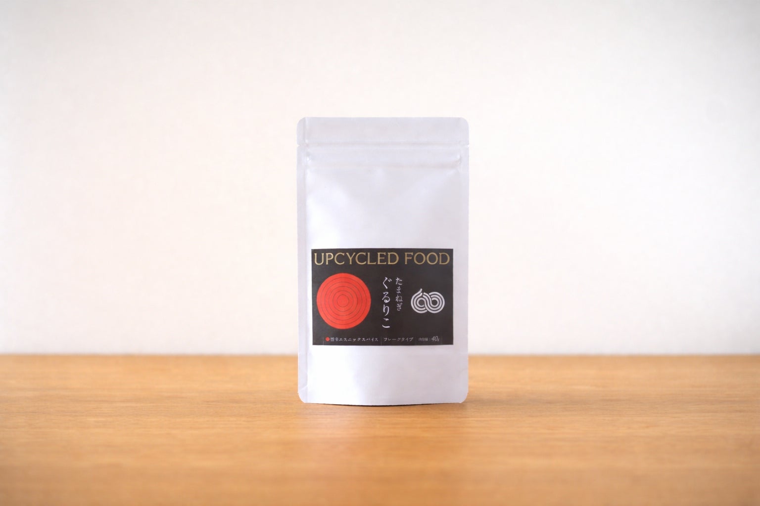 「タマネギぐるりこ」は、大手牛丼チェーンの野菜加工センターで発生する、玉ねぎ端材をアップサイクルしたクラフト調味料です。これまで廃棄されていたタマネギの芯や、スライス時の規格外サイズの端材を、独自の過熱蒸煎技術で乾燥・殺菌し、香り豊かなフレークに生まれ変わらせています。統計に表れにくい食品の製造過程で発生する「かくれフードロス」の削減に取り組みながら、「もったいない」を「おいしい」に変える新たな提案を行っています。