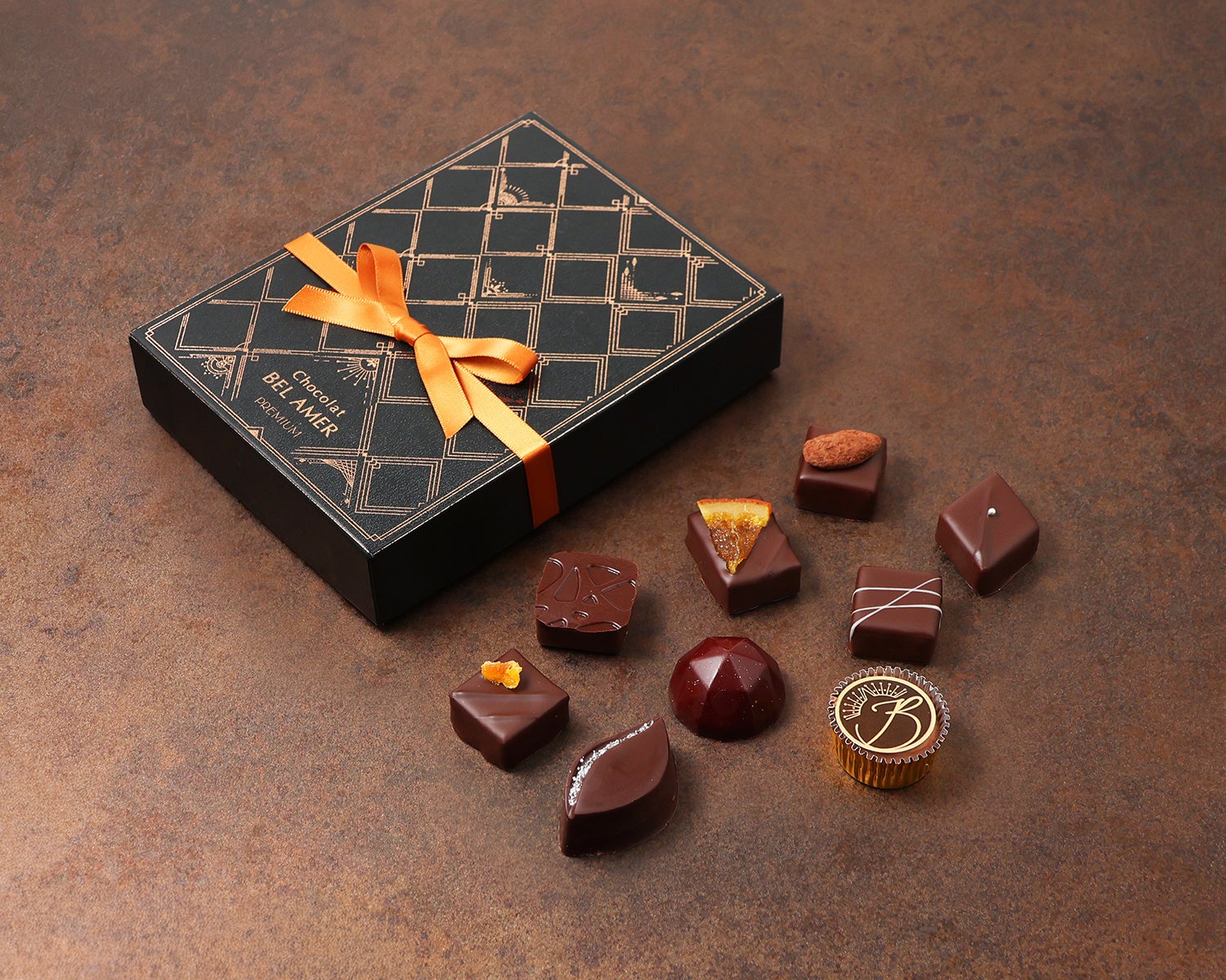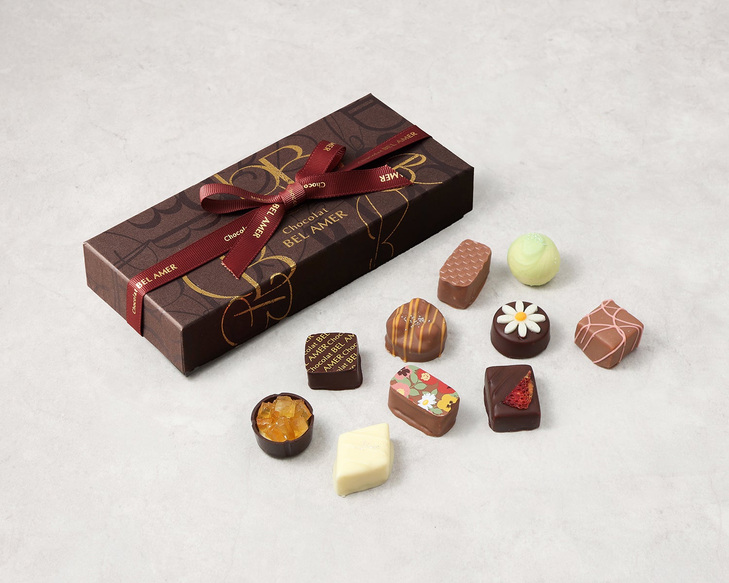 ベルアメールこだわりのチョコレートを中心に、素材と技が織りなす多彩な味わいをお楽しみいただけます。期間限定のフレーバーを加え、季節の贈りものにもふさわしい、上品なボックスに詰め合わせました。
