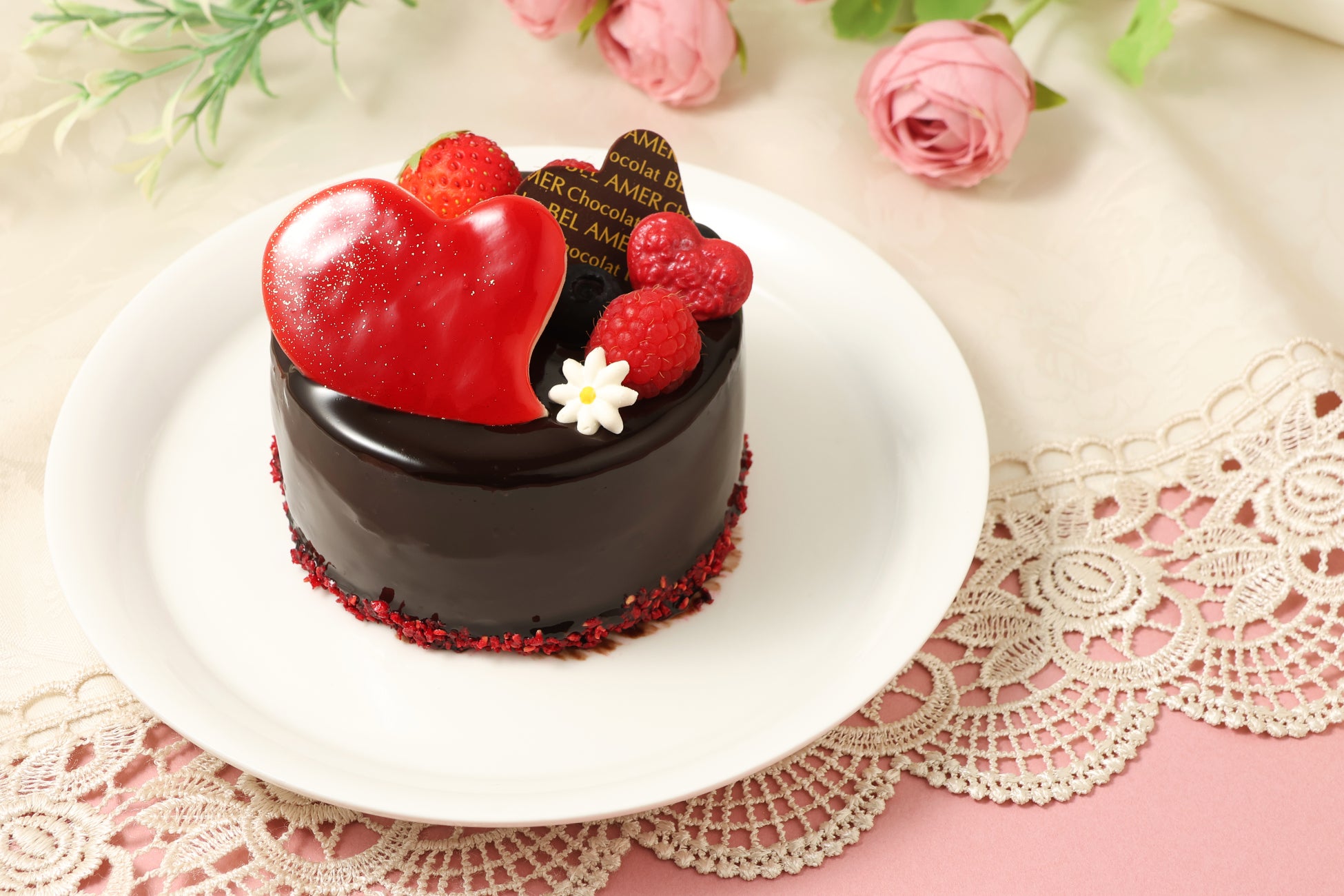 真っ赤なハートとベリーで華やかにデコレーションし、特別な日のギフトやスイーツとしてぴったりの一品です。