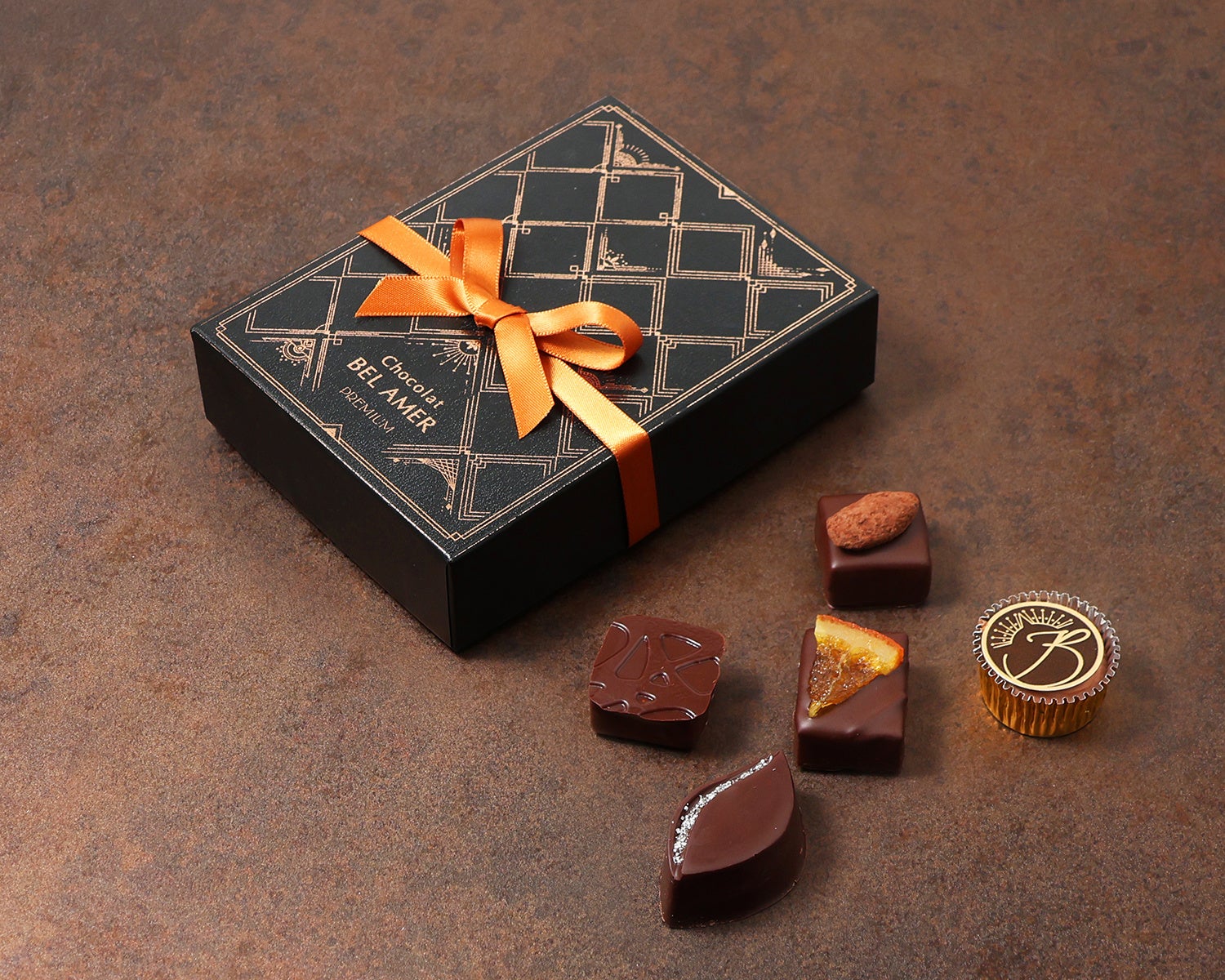 ベルアメールこだわりのチョコレートを中心に、素材と技が織りなす多彩な味わいをお楽しみいただけます。期間限定のフレーバーを加え、季節の贈りものにもふさわしい、上品なボックスに詰め合わせました。