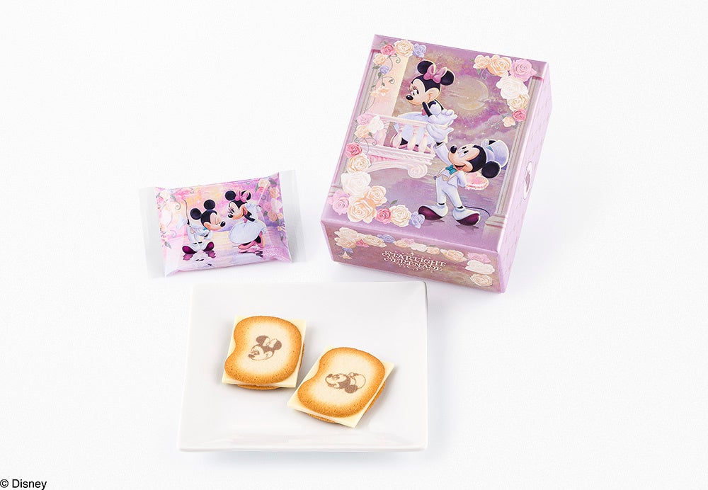 バラ色の星空を舞台にした、『スターライトセレナーデ/ショコラサンド「見ぃつけたっ」』。10枚入ボックスは、星をあつめたハートを「ミニーマウス」に贈る「ミッキーマウス」を描いたスペシャルデザイン。愛溢れる2人の雰囲気を、パール加工で月明かりに照らされているように上品な輝きが包み込みます。