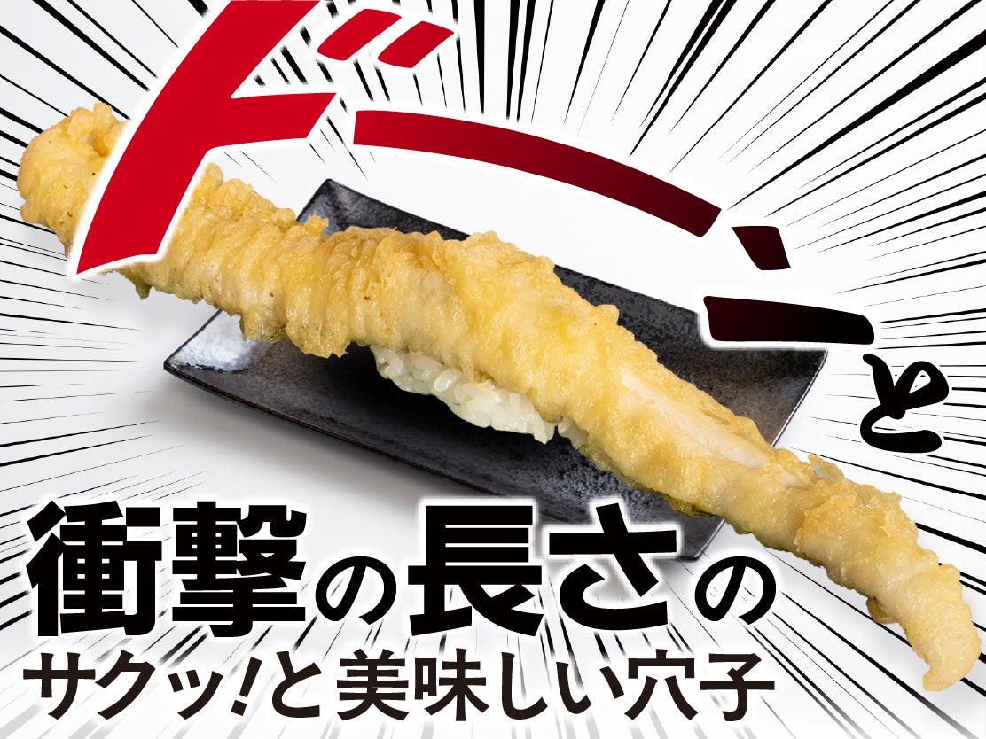 特大穴子天握りや甘辛国産さばカツ一本握りなど、食べ応え抜群のデカネタ寿司に加え、