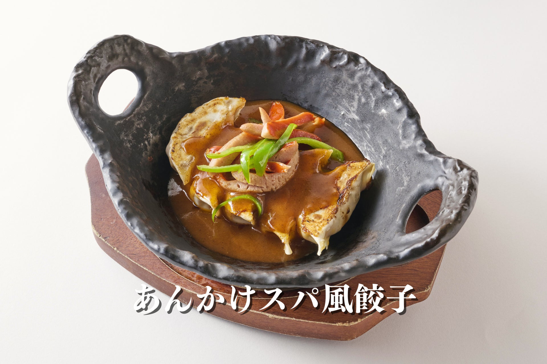 あんかけスパ風餃子:名古屋の喫茶店文化が生んだ「あんかけスパ」を餃子と融合。ピーマンと赤ウインナーを添え、スパイシーなあんかけソースをたっぷりかけた一皿。